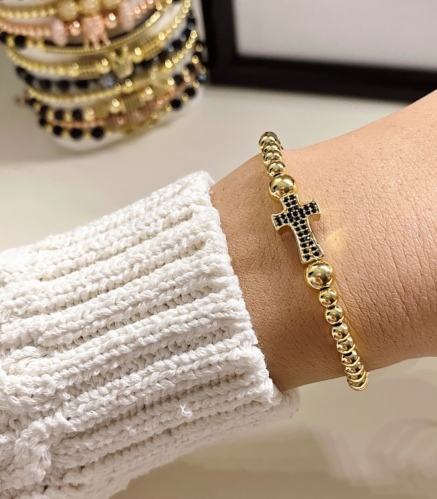 Etichete: Bratara dama model deosebit cu margele aurii si cruce cu pietricele negre, ,