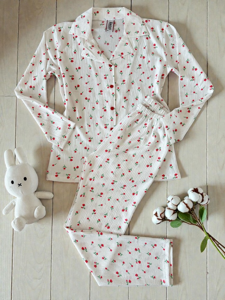 Pijama dama ieftina bumbac lunga cu pantaloni lungi albi si bluza alba cu imprimeu trandafiri