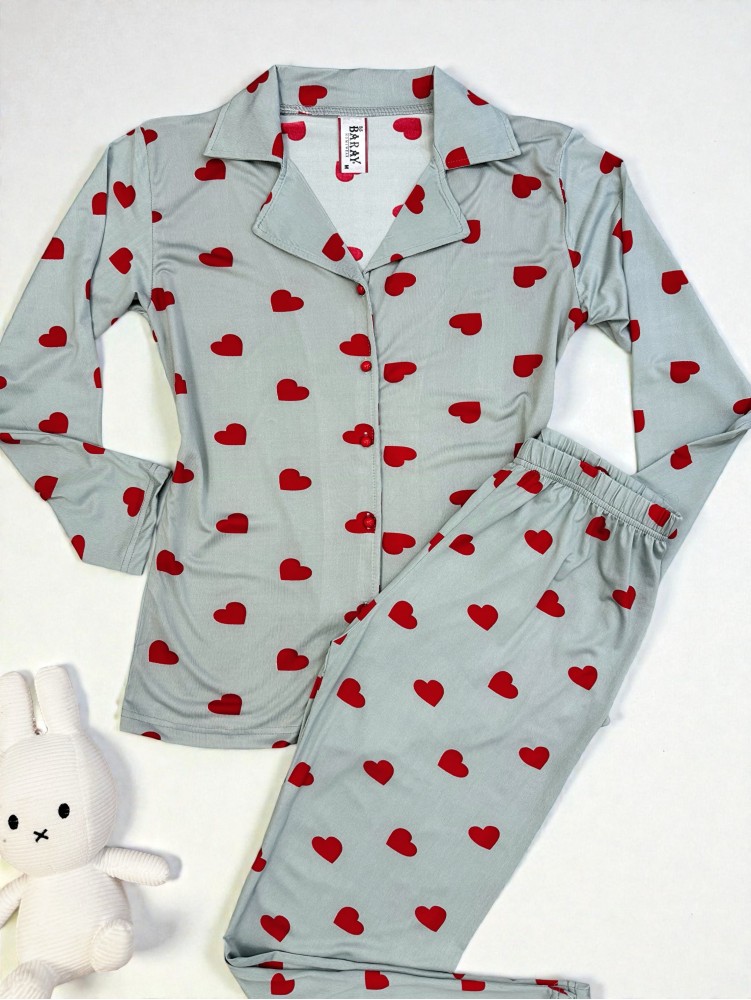 Pijama dama ieftina bumbac si lycra lunga cu bluza gri si pantaloni lungi gri cu imprimeu inimioare rosii