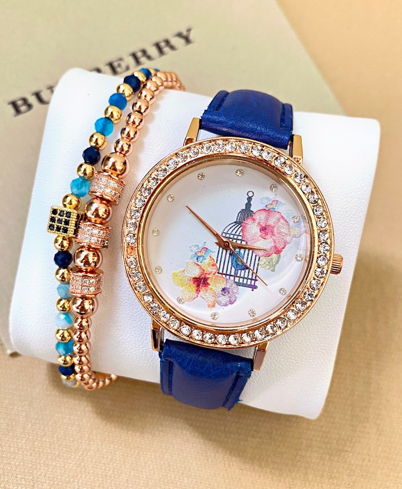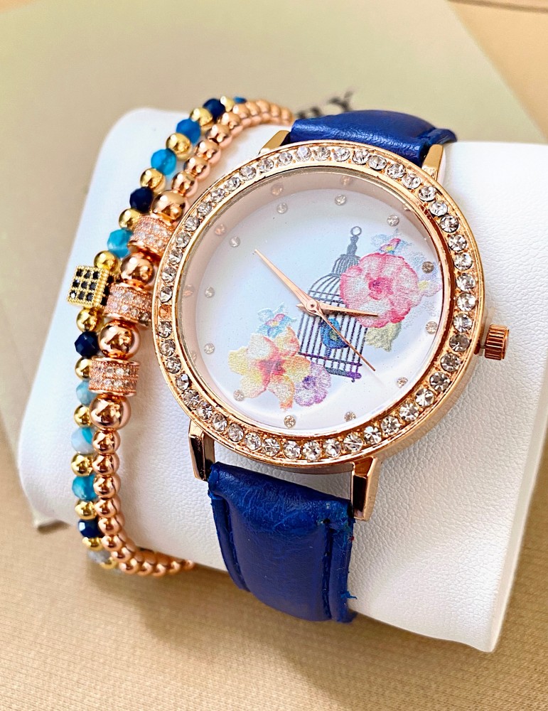 Ceas dama albastru cu bratara din piele ecologica si cadran cu Paint