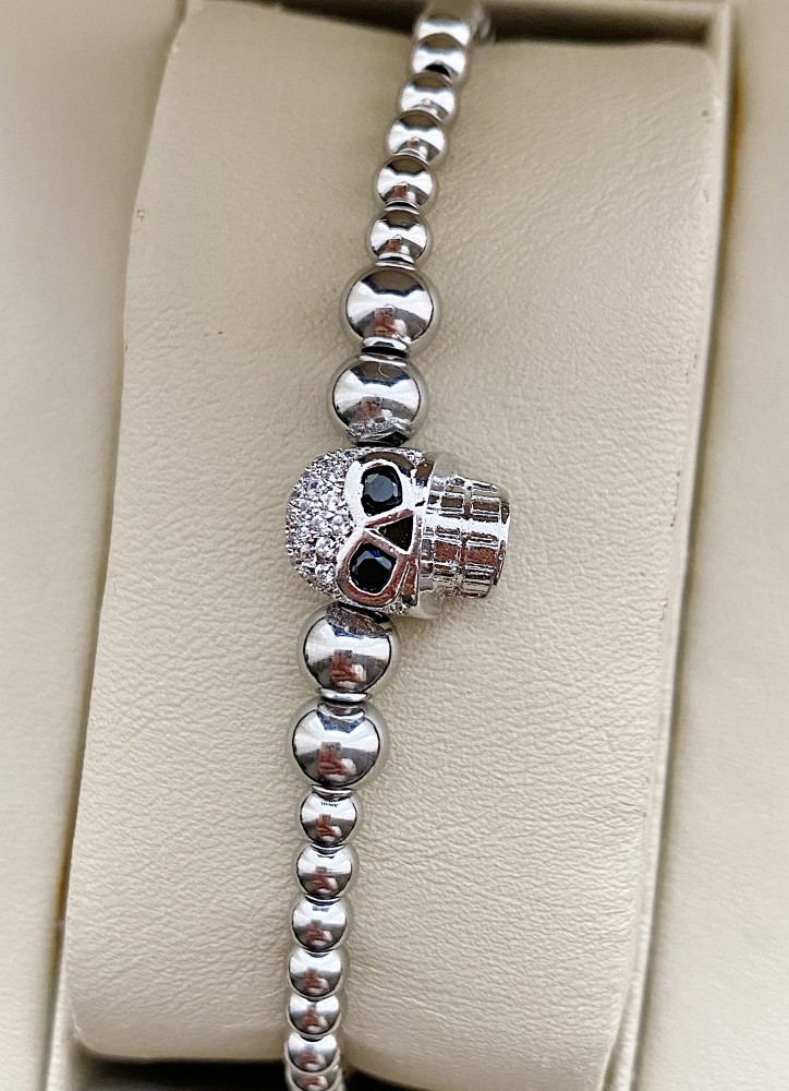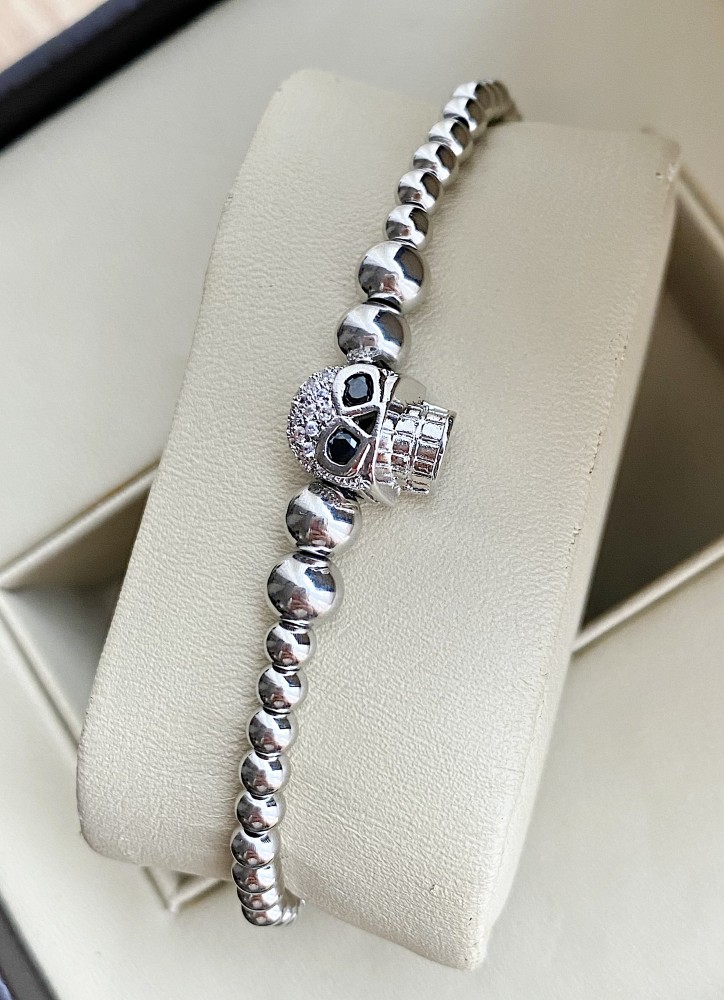 Bratara dama model deosebit cu margele argintii si craniu argintiu