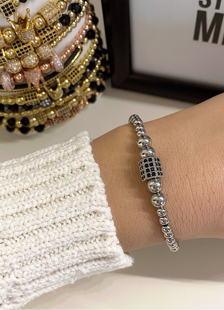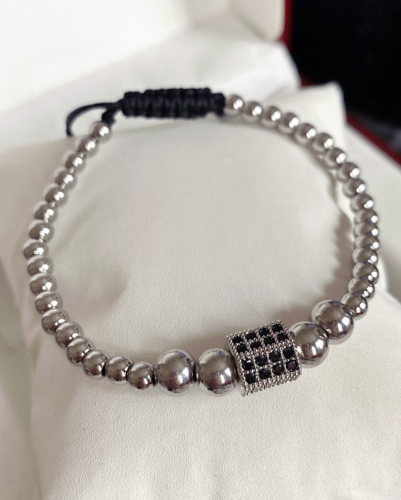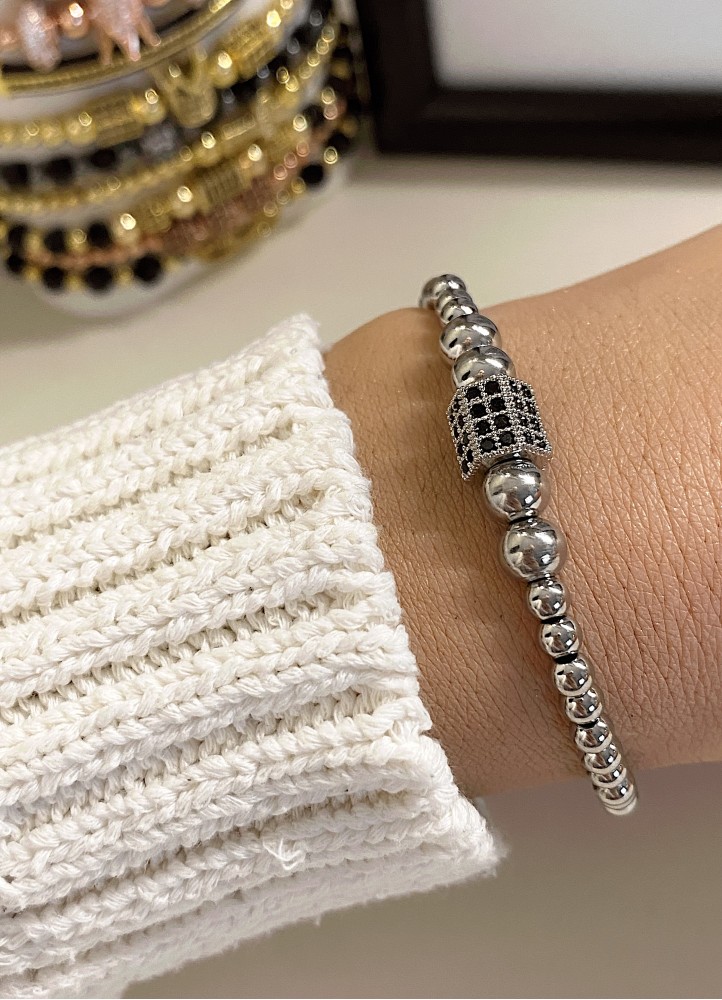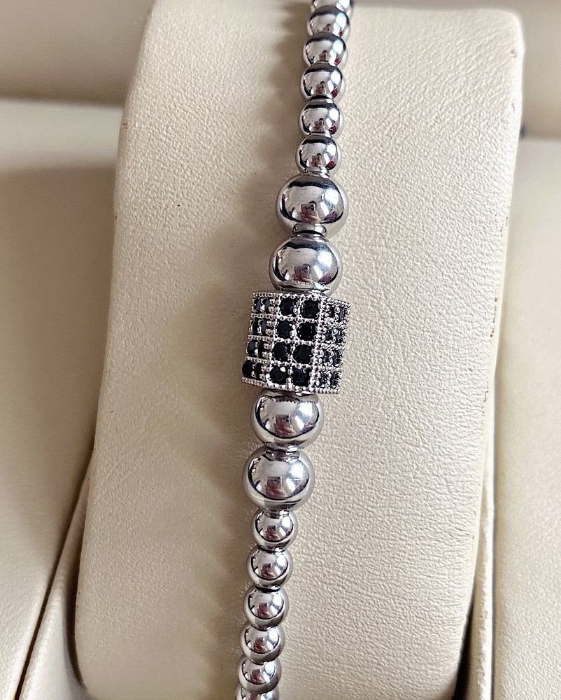 Bratara dama model deosebit cu margele argintii si hexagon cu pietricele negre