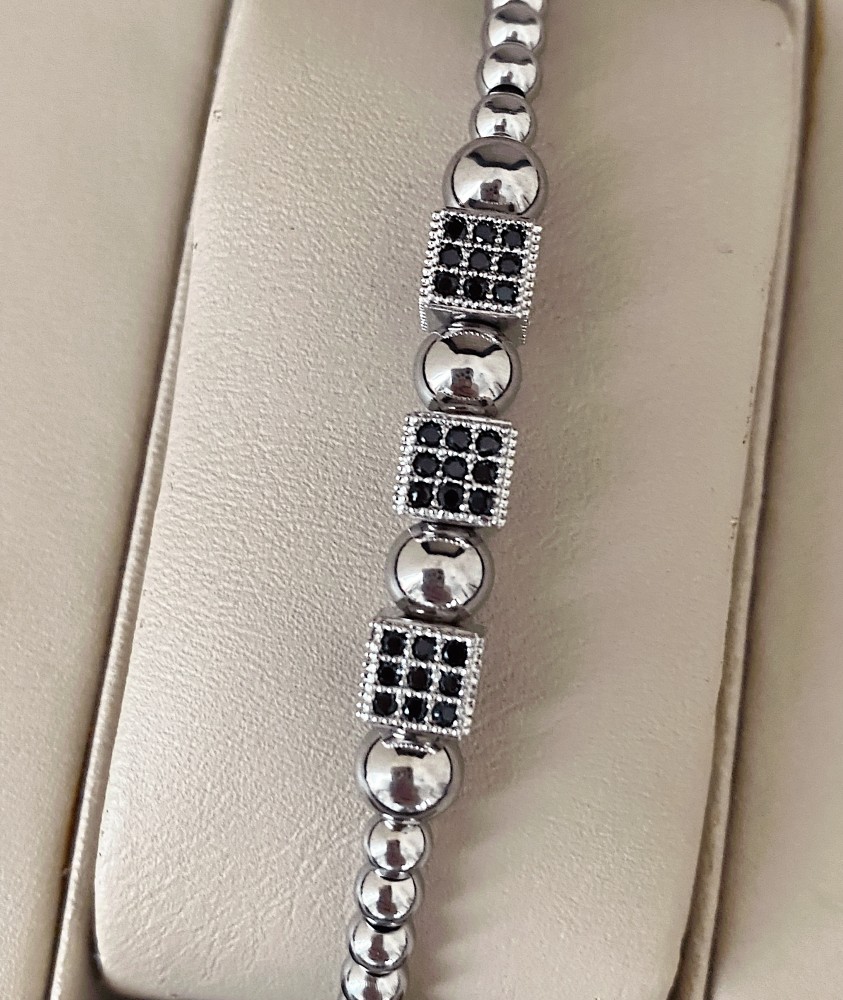 Bratara dama model deosebit cu margele argintit si patrate cu pietricele negre