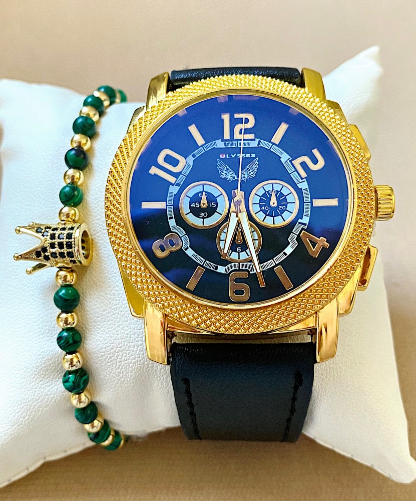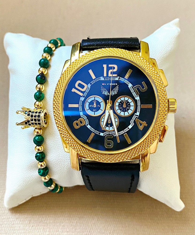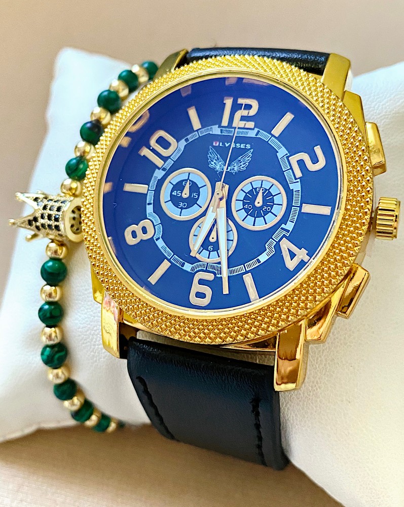 Ceas barbat negru cu bratara din piele ecologica si cadran albastru cu auriu