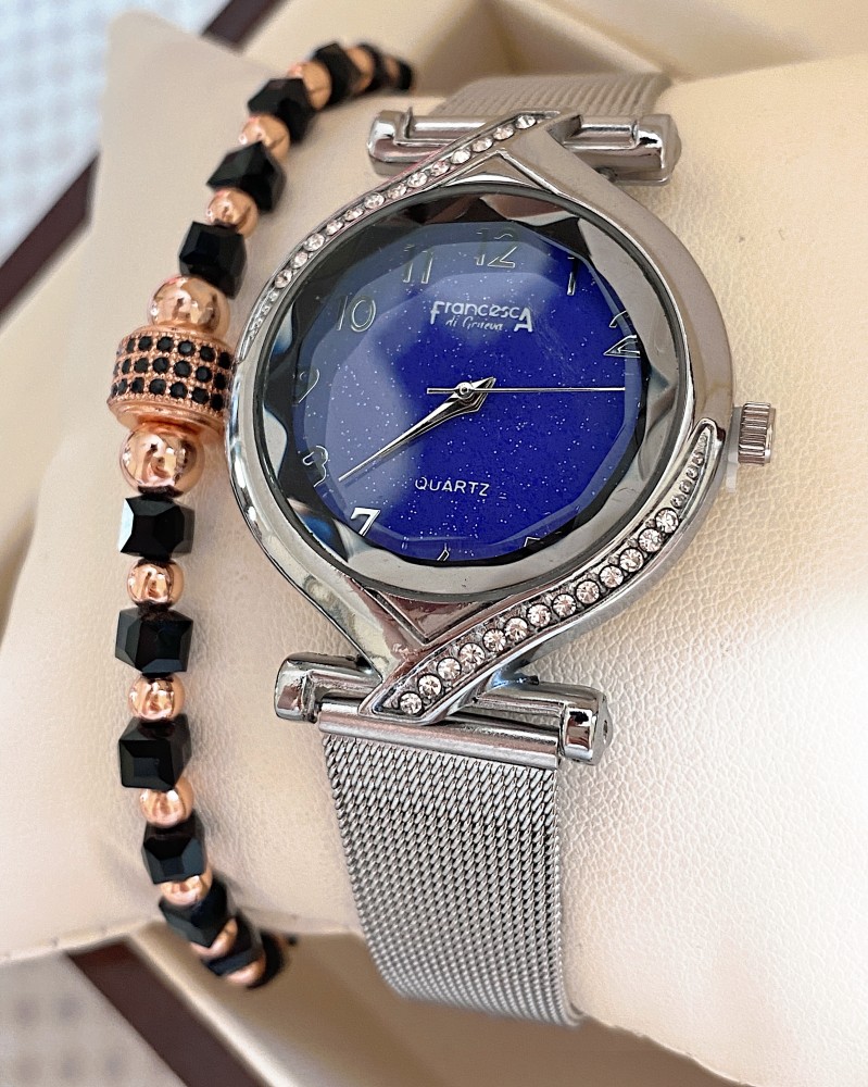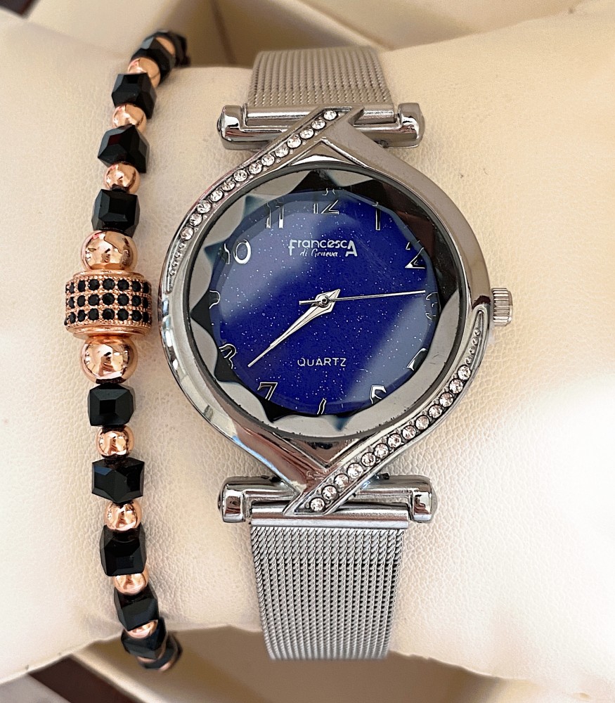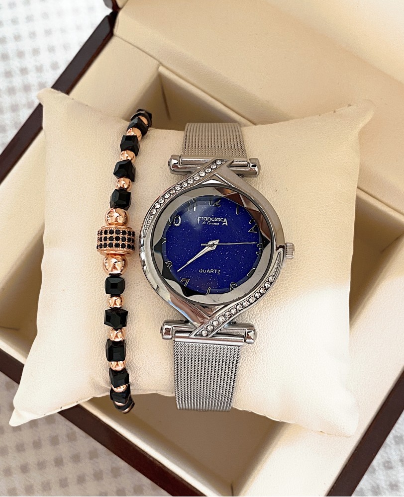 Ceas dama argintiu cu bratara metalica si cadran albastru