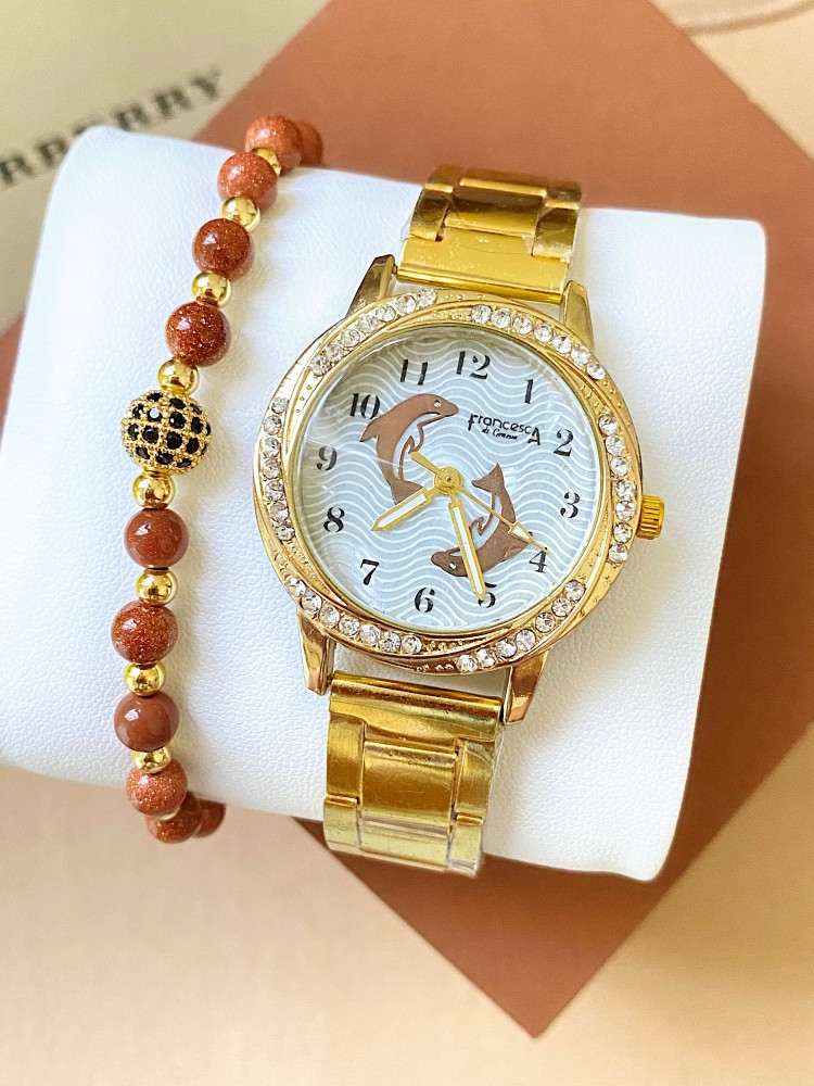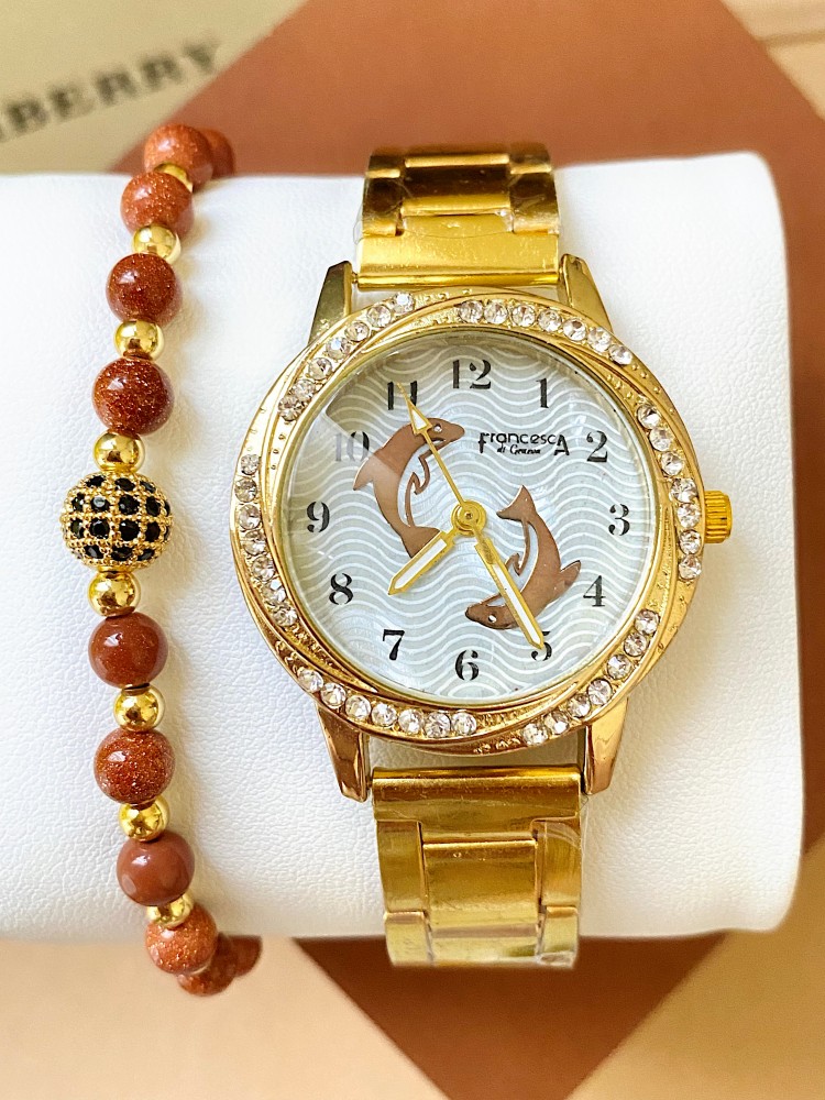 Ceas dama auriu cu bratara metalica si cadran alb cu pesti
