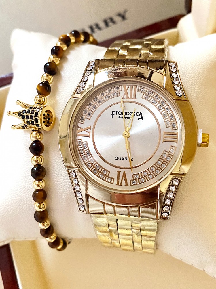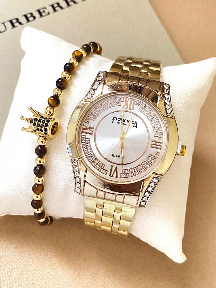 Ceas dama auriu cu bratara metalica si cadran auriu cu pietricele