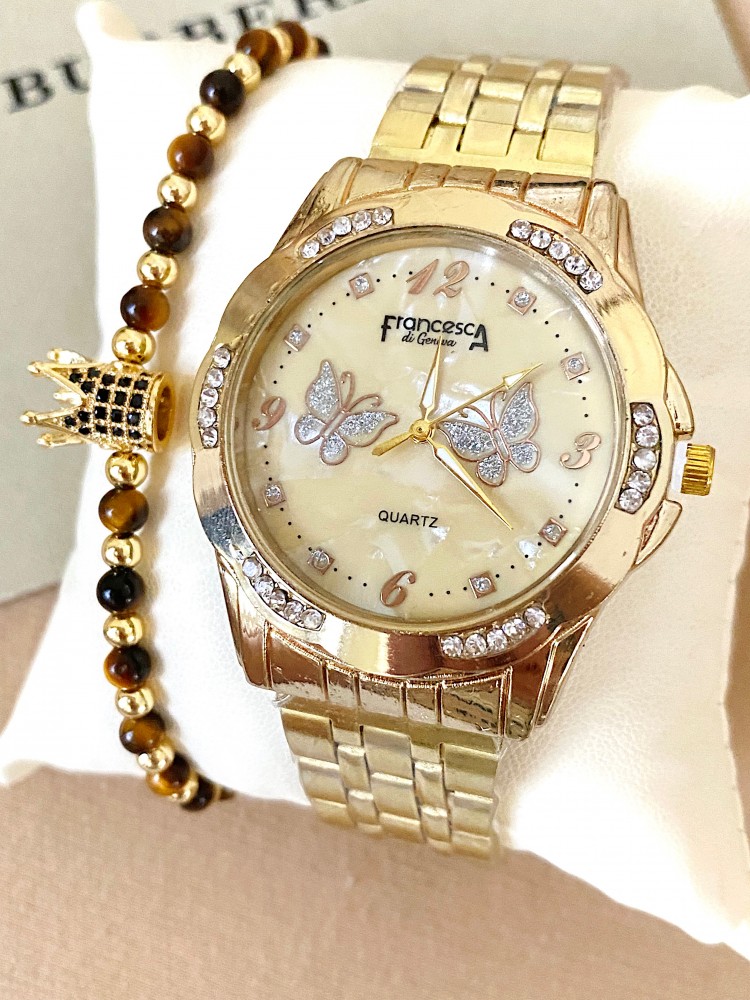 Ceas dama auriu cu bratara metalica si cadran cu fluturi