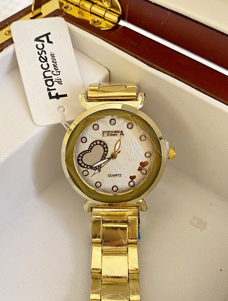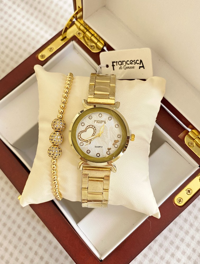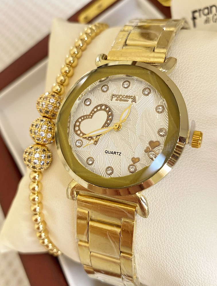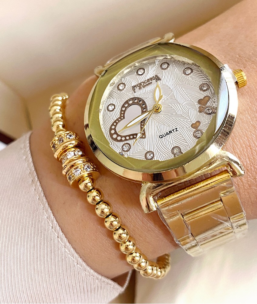 Ceas dama auriu cu bratara metalica si cadran cu inimioara