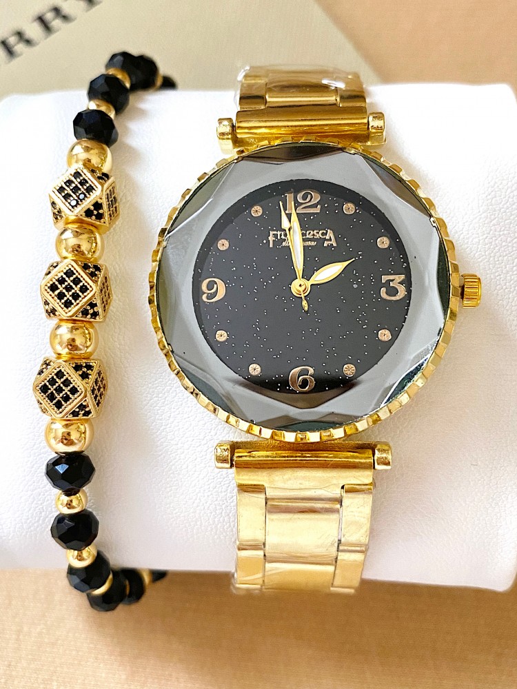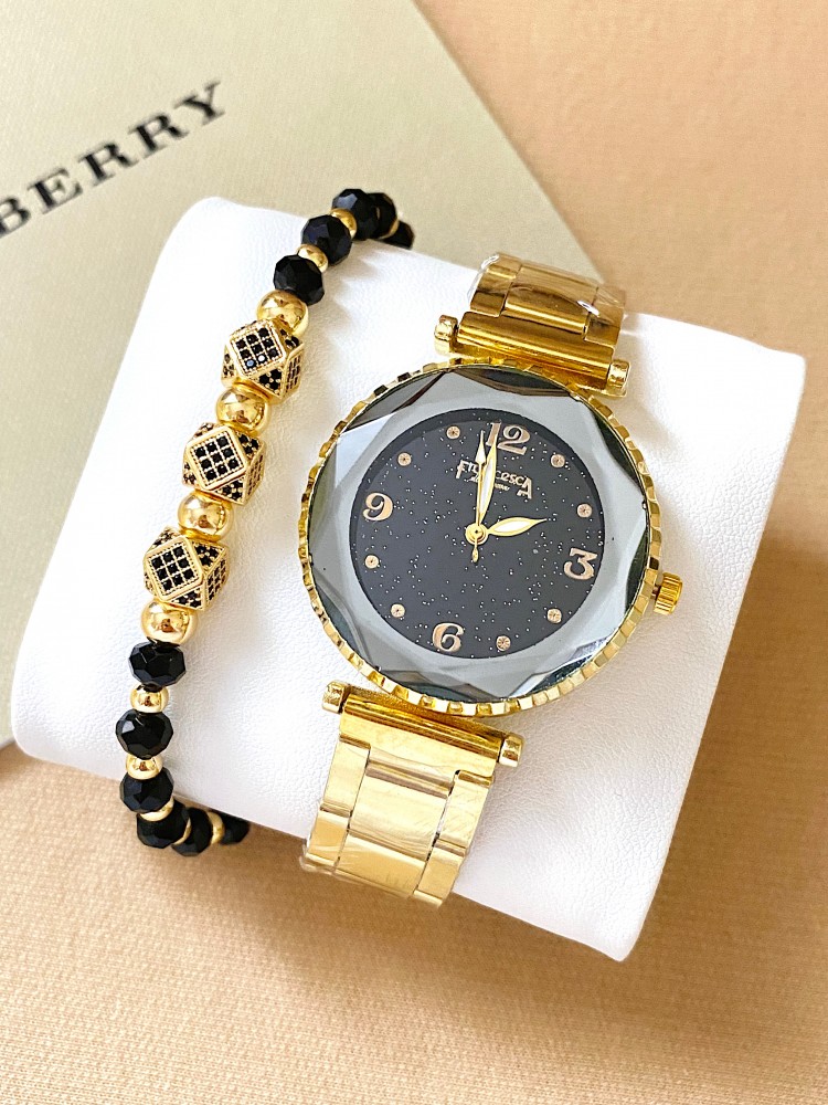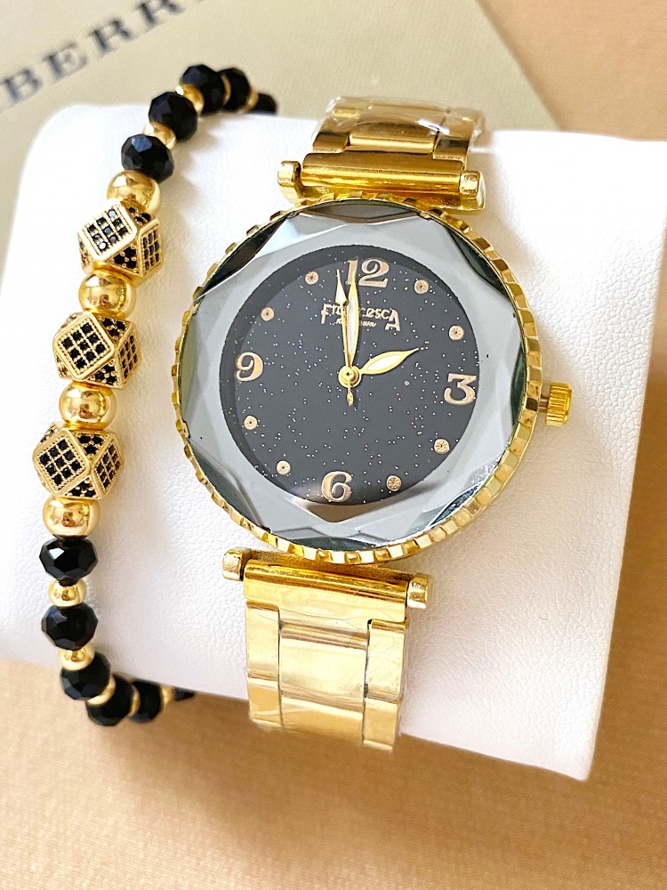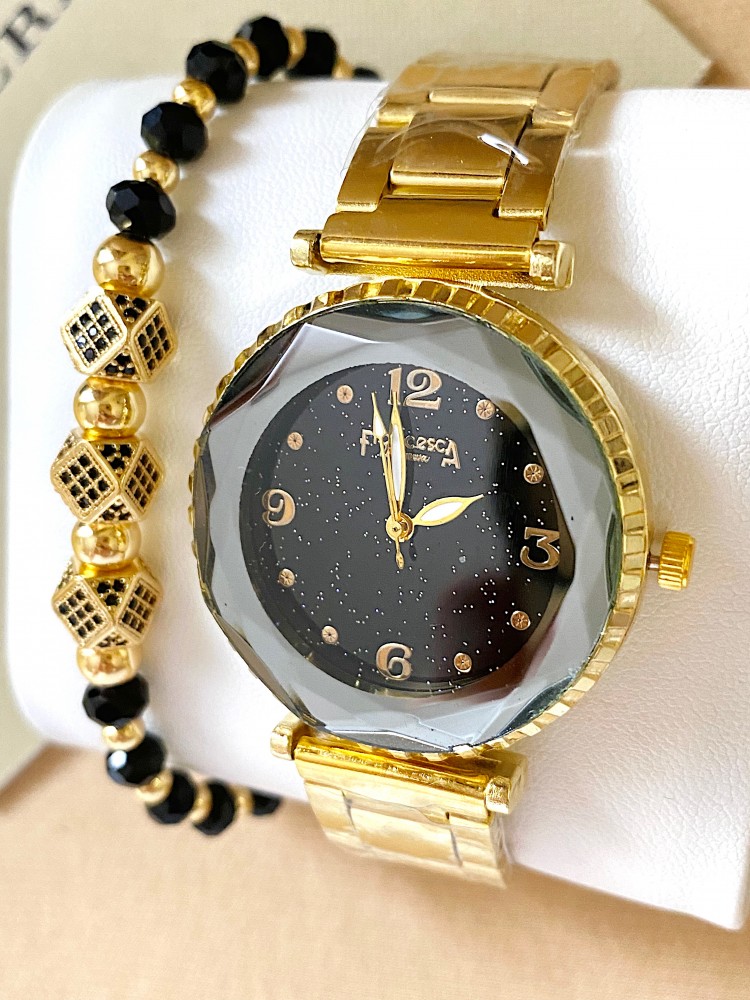 Ceas dama auriu cu bratara metalica si cadran negru