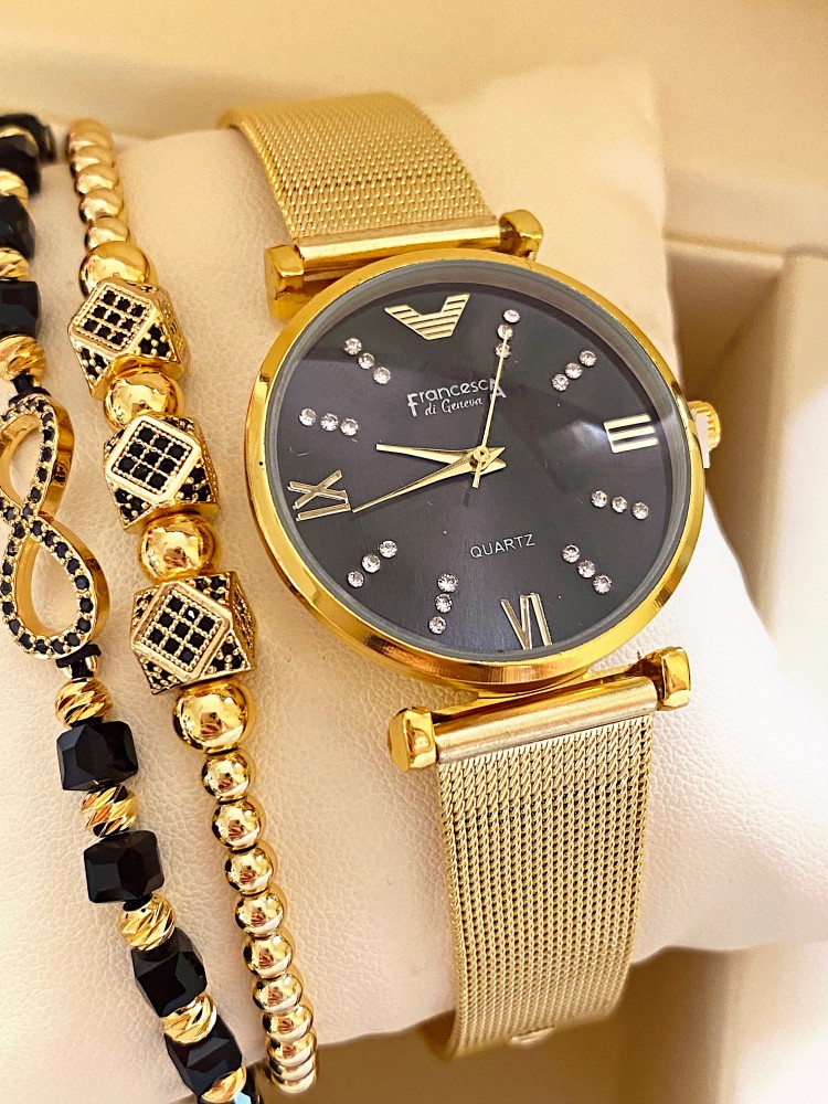 Ceas dama auriu cu bratara metalica si cadran negru simplu