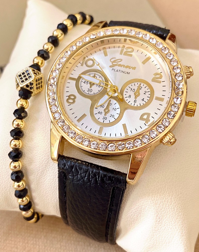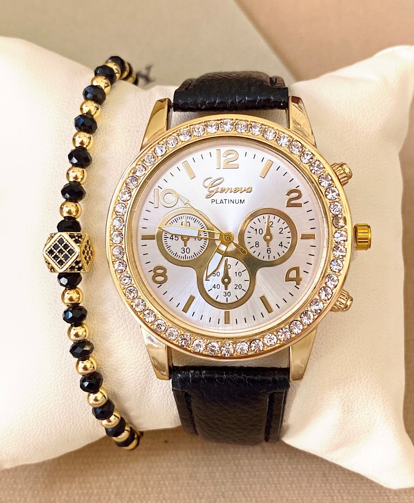Ceas dama negru cu bratara din piele ecologica si cadran auriu