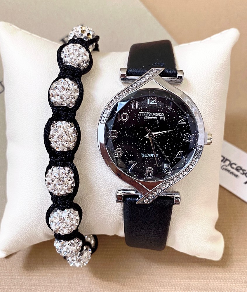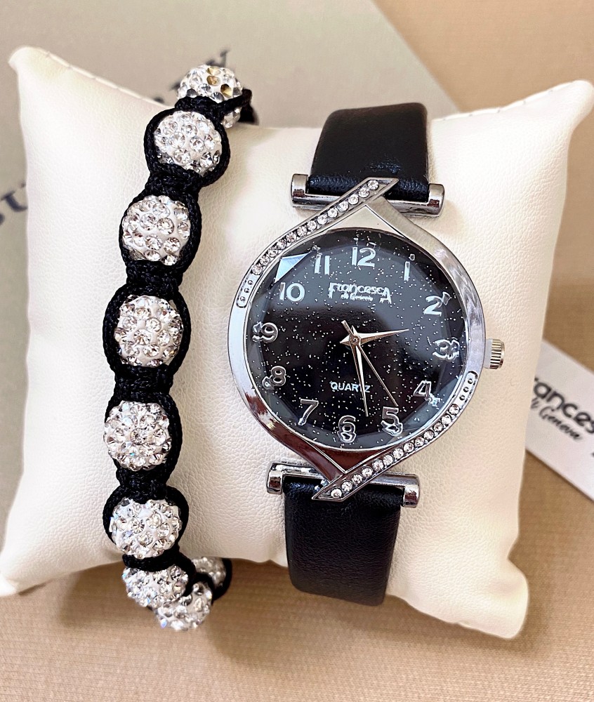 Ceas dama negru cu bratara din piele ecologica si cadran cu argintiu