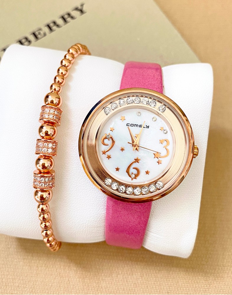 Ceas dama roz cu bratara din piele ecologica si cadran cu 3 cifre