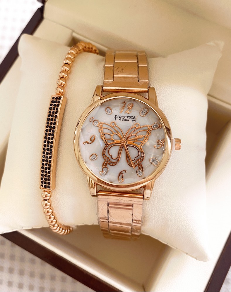 Ceas dama roze cu bratara metalica si cadran cu fluture mare