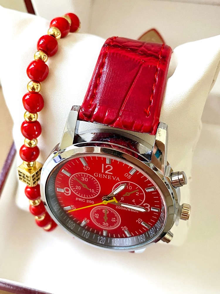 Ceas unisex rosu cu bratara din piele ecologica si cadran cu argintiu