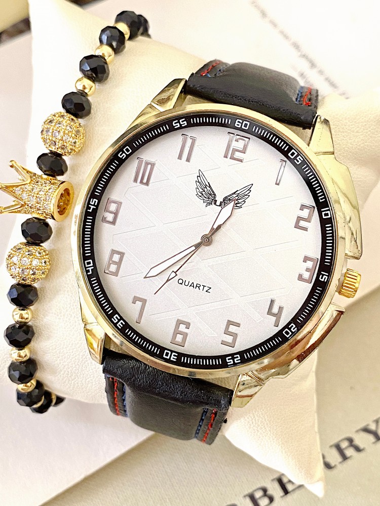 Ceas barbat negru cu bratara din piele ecologica si cadran alb
