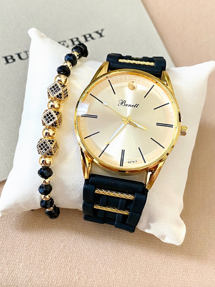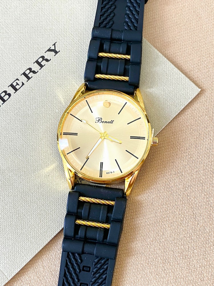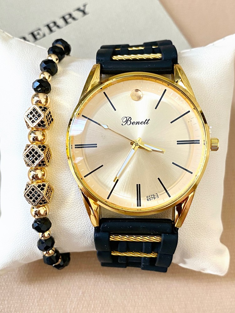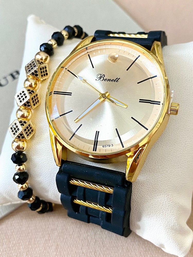 Ceas barbat negru cu bratara din piele ecologica si cadran auriu