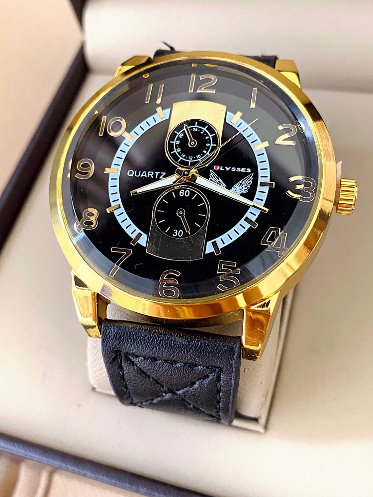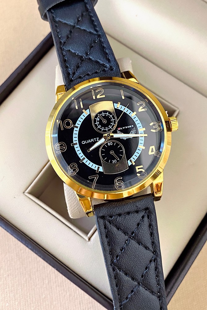 Ceas barbat negru cu bratara din piele ecologica si cadran cu auriu