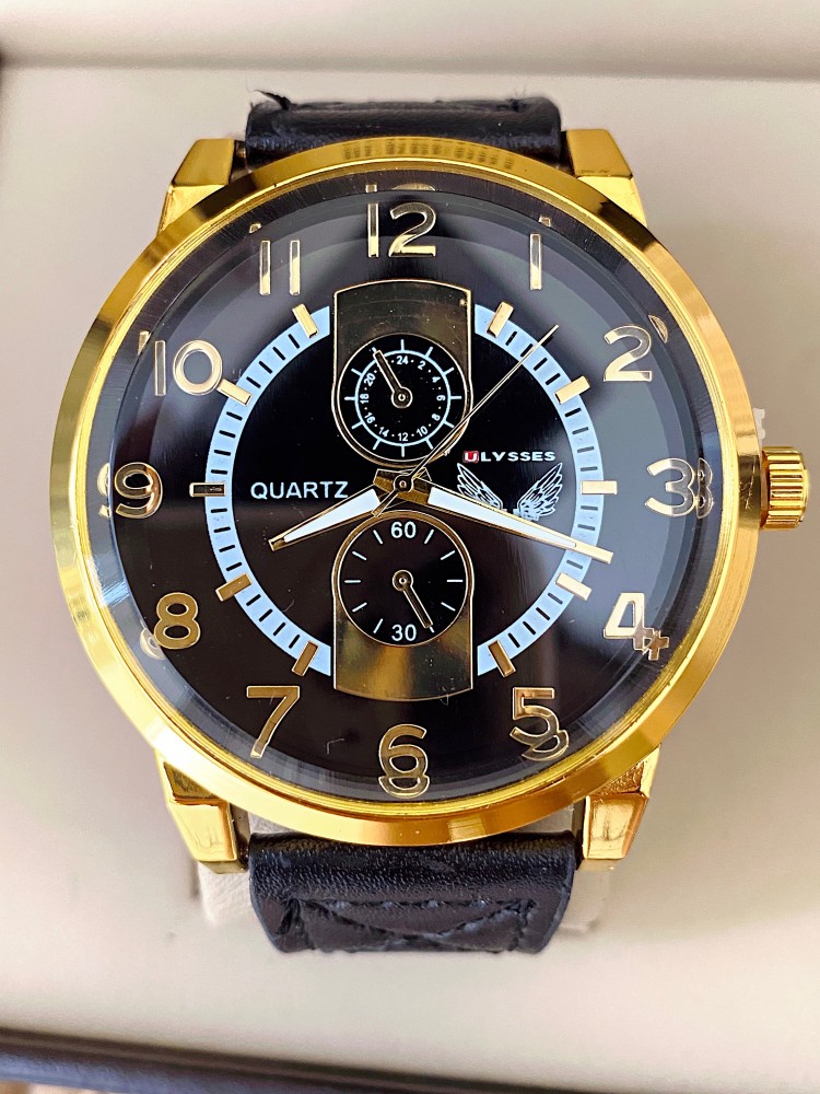 Etichete: Ceas barbat negru cu bratara din piele ecologica si cadran cu auriu, ,