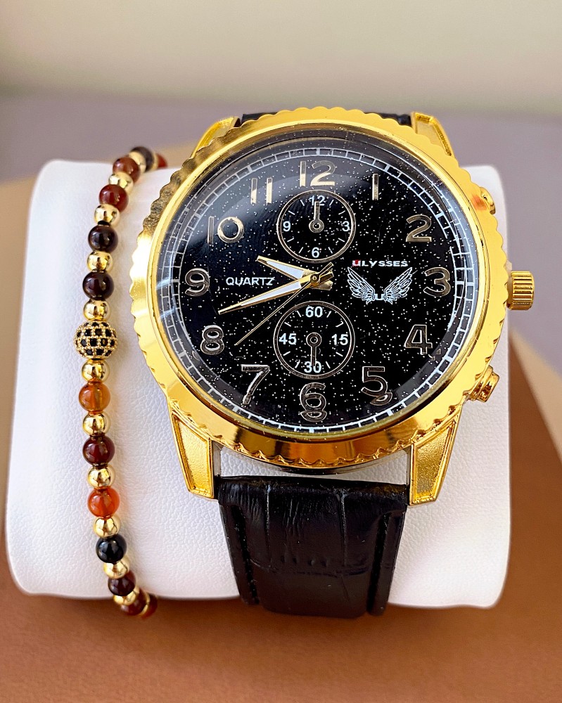 Ceas barbat negru cu bratara din piele ecologica si cadran cu auriu
