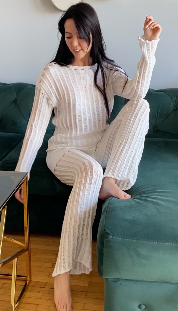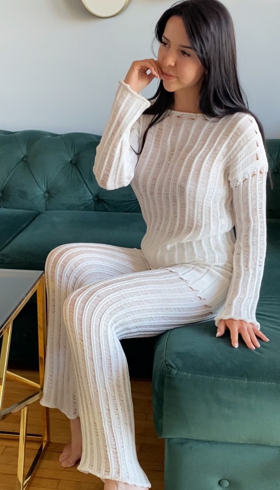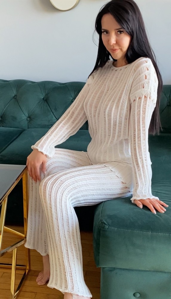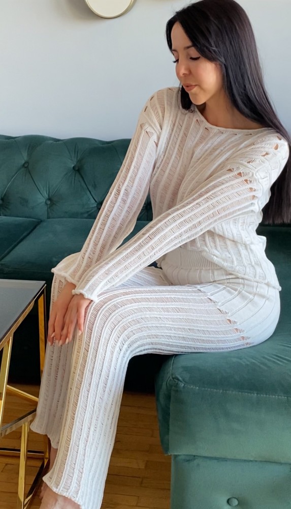Compleu dama alb tricot lejer, modern si elegant pentru plaja, terasa sau oras