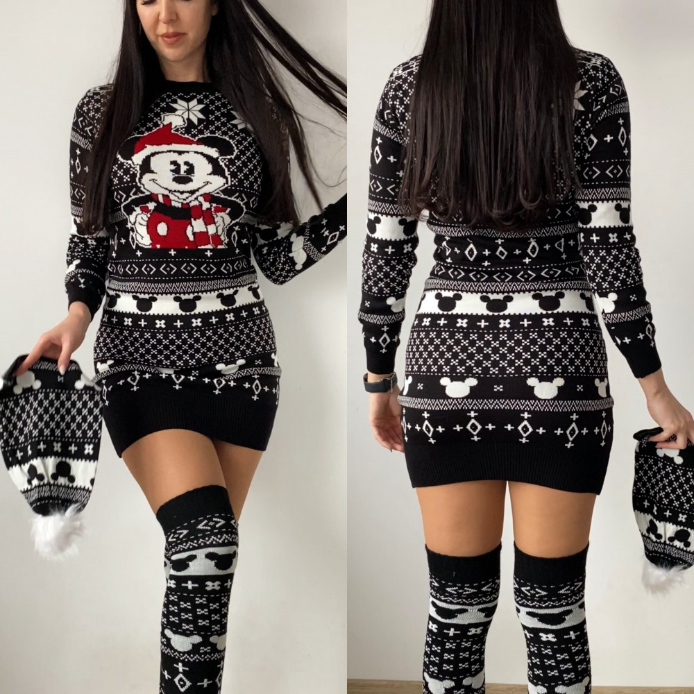 Compleu dama ieftin din tricot negru minunat compus din rochie, caciula si jambiere Craciun MK