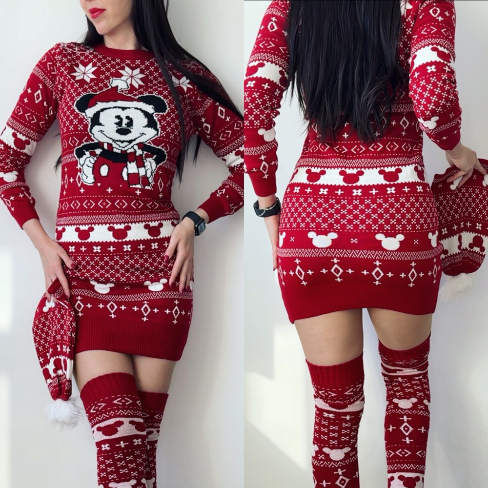 Compleu dama ieftin din tricot rosu minunat compus din rochie, caciula si jambiere Craciun MK