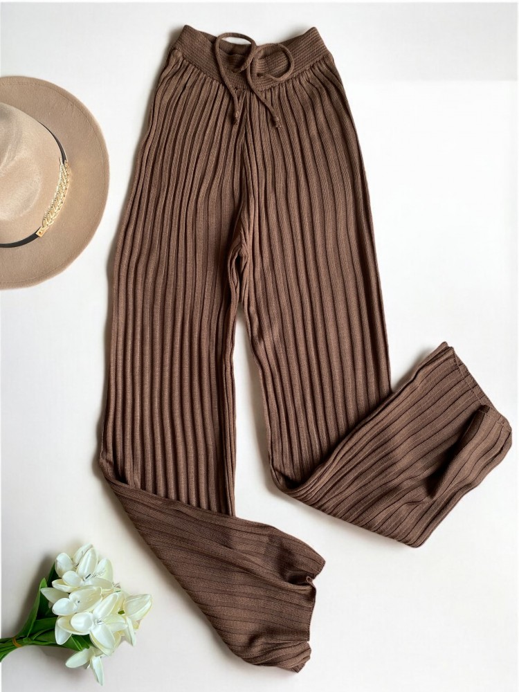 Pantaloni dama din tricot SUBTIRE maro inchis cu snur in talie