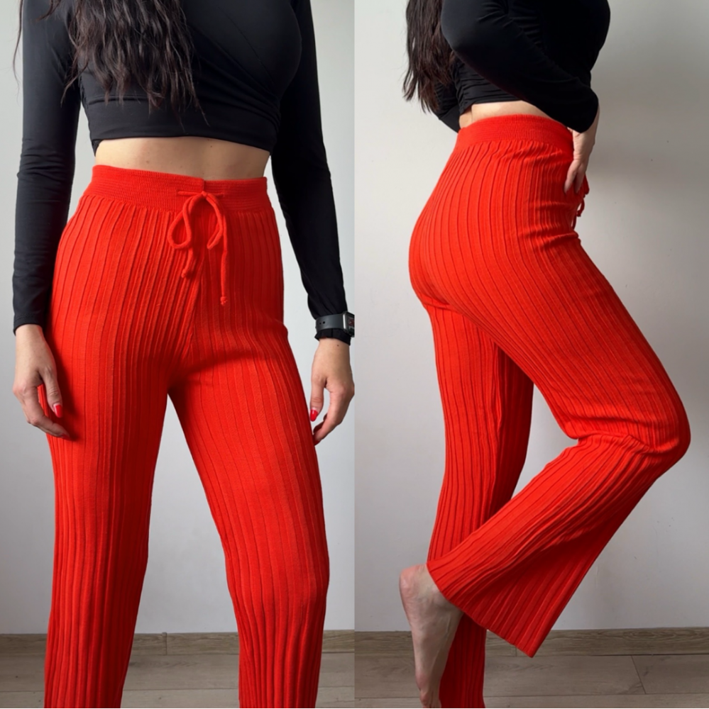 Pantaloni dama din tricot SUBTIRE portocalii cu snur in talie