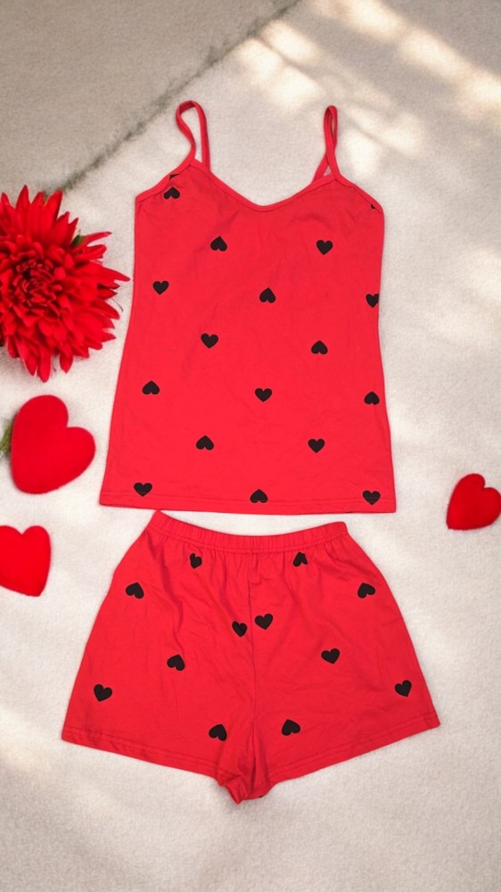 Pijama dama din bumbac cu maieu si pantaloni scurti cu imprimeu inimioare