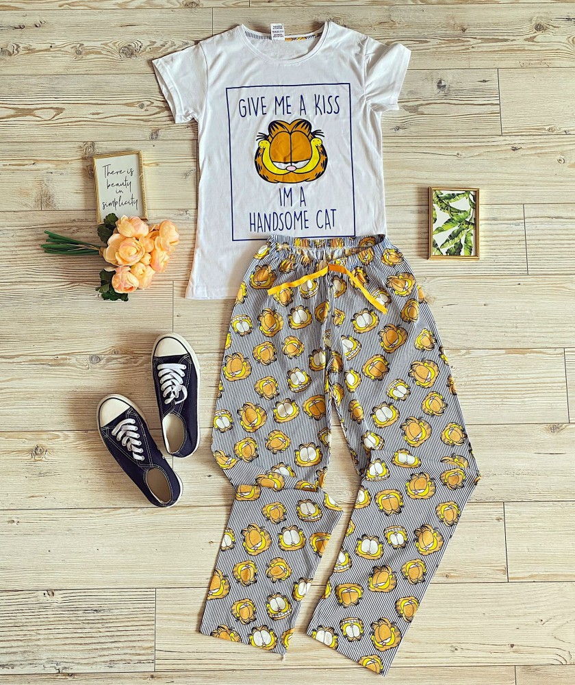 Pijama dama ieftina bumbac lunga cu tricou alb si pantaloni lungi gri cu imprimeu GF Handsome