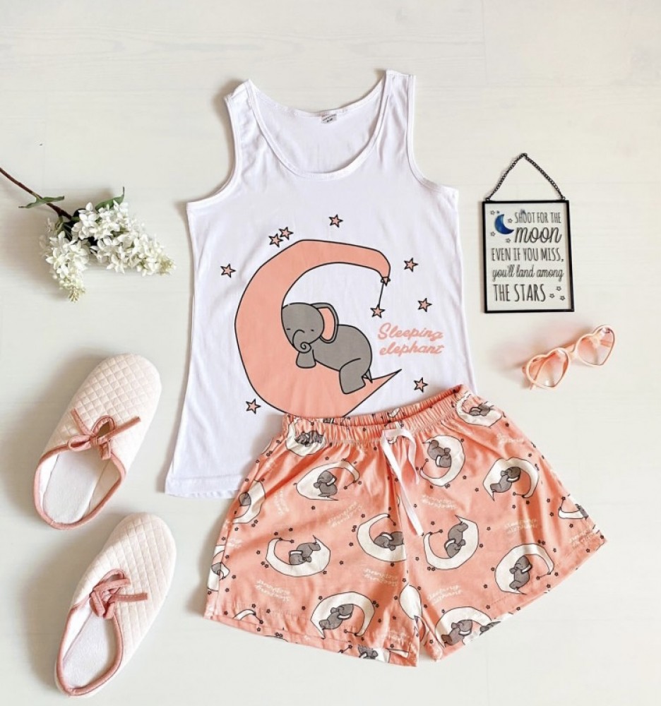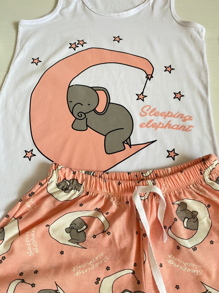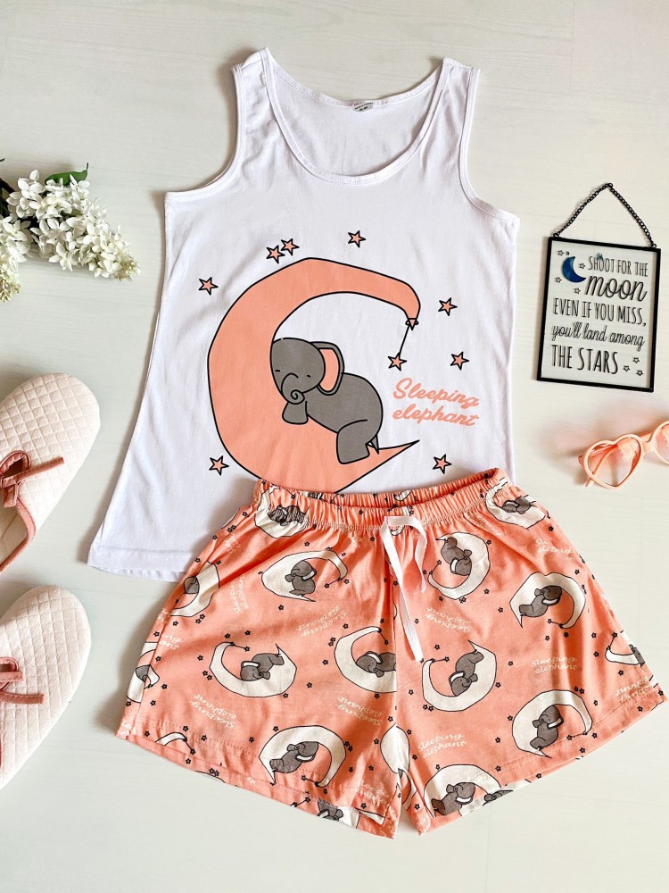 Pijama dama ieftina bumbac scurta cu maieu alb si pantaloni scurti corai cu imprimeu Elefantel