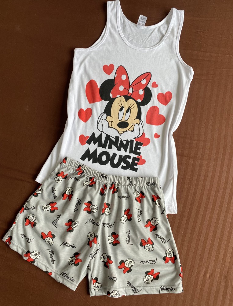 Pijama dama ieftina bumbac scurta cu maieu alb si pantaloni scurti draguti gri cu inimioare si cu imprimeu MINNIE happy