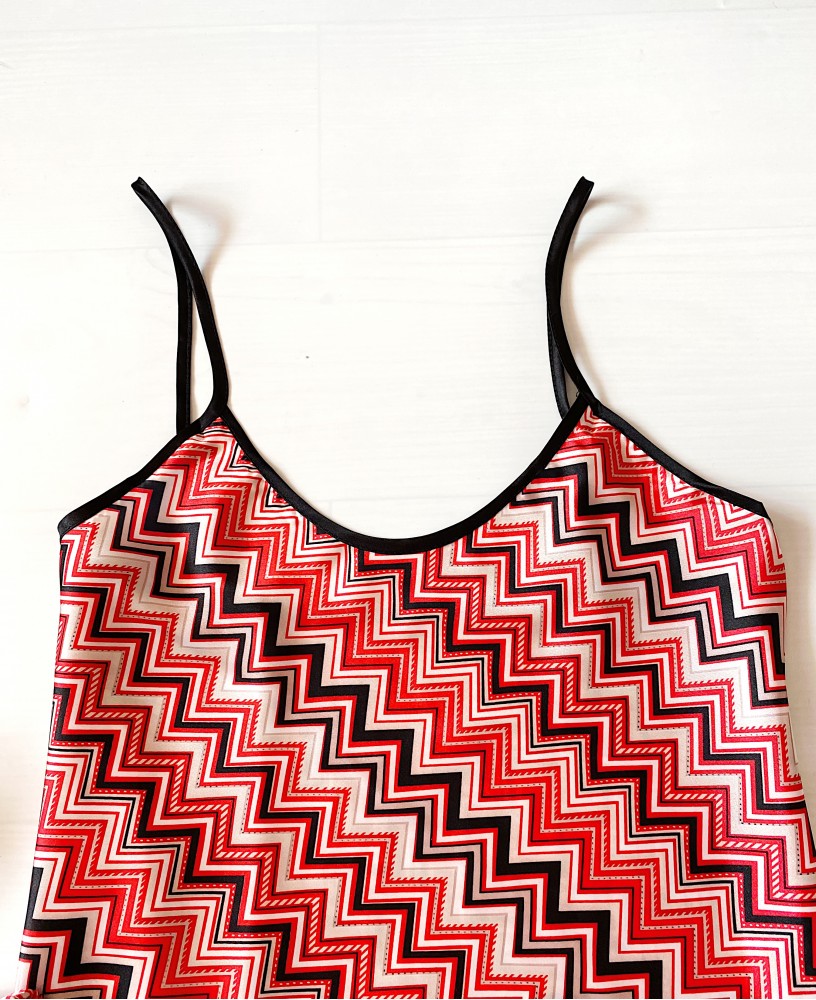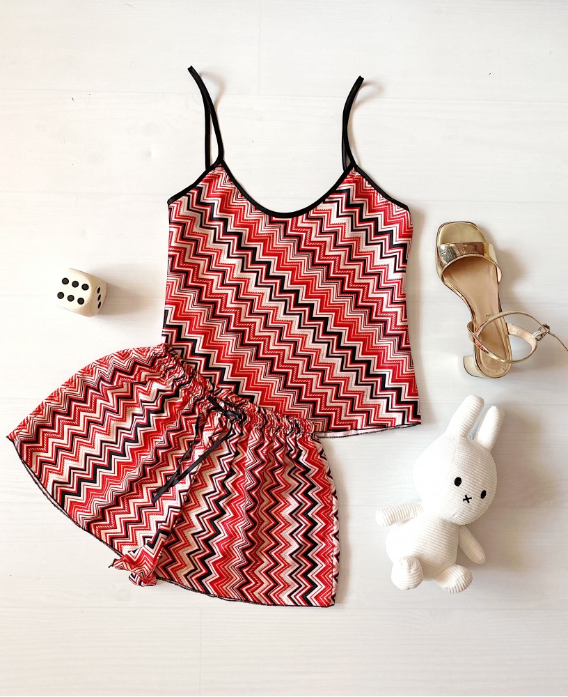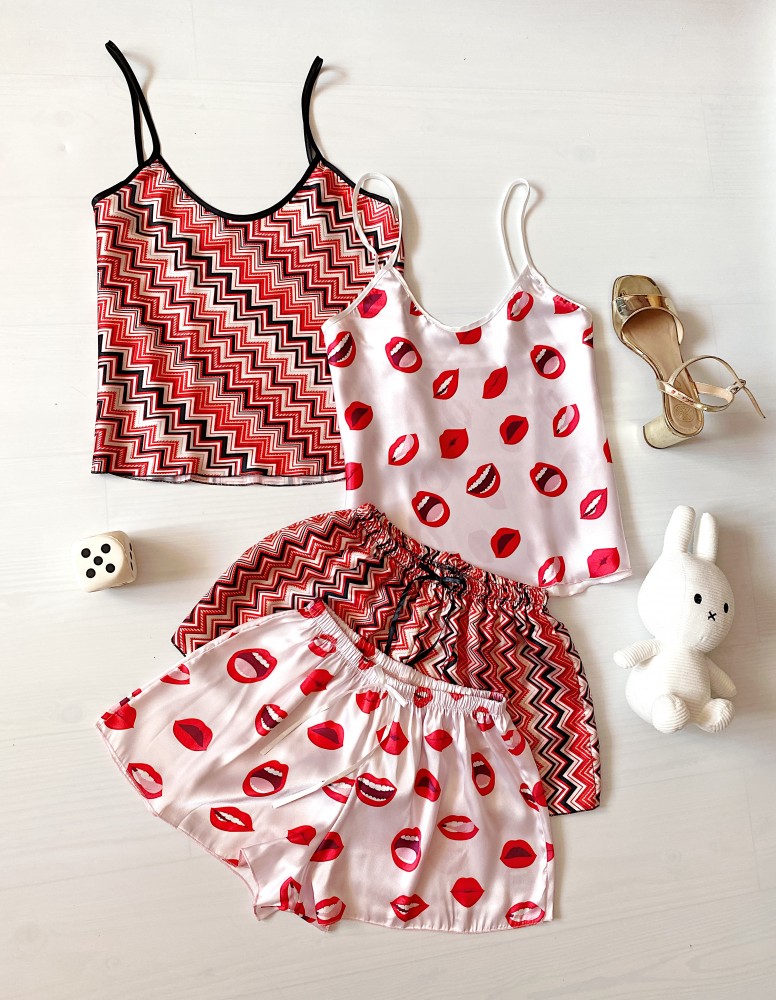 Pijama dama ieftina cu aspect satinat cu maieu si pantaloni scurti cu imprimeu zig-zag - Dinamism si Vitalitate