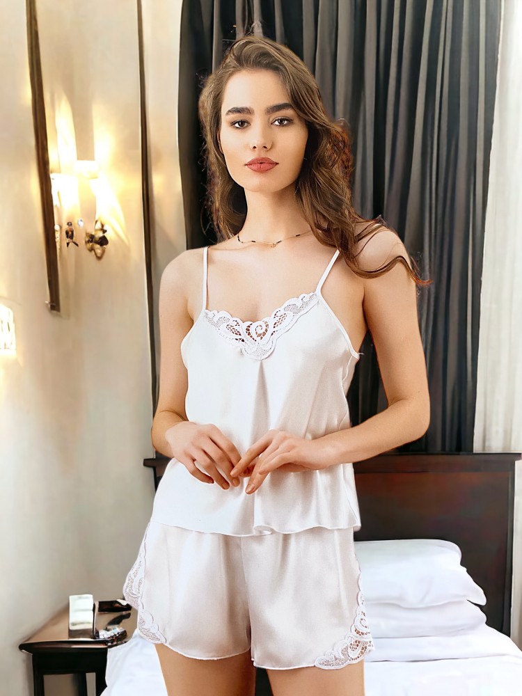 Pijama Dama ieftina cu aspect satinat formata din maieu cu bretele si pantaloni scurti cu dantela alba