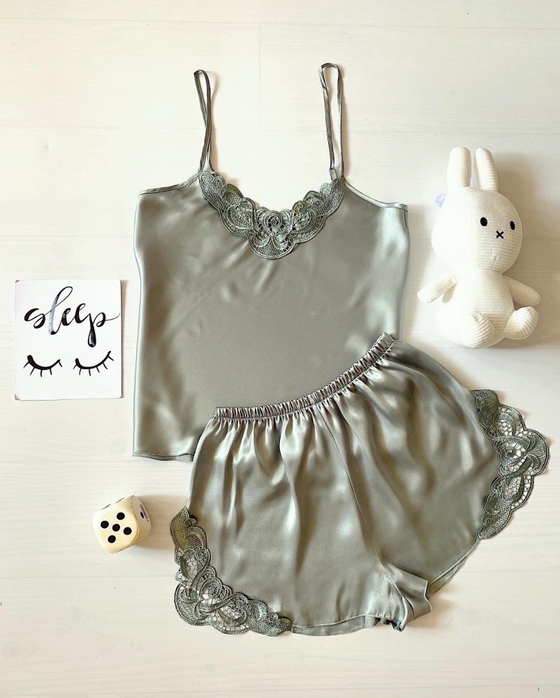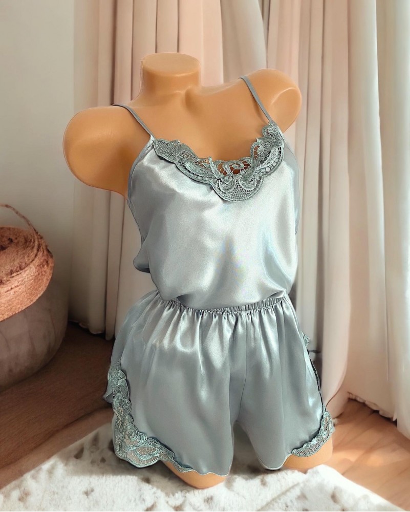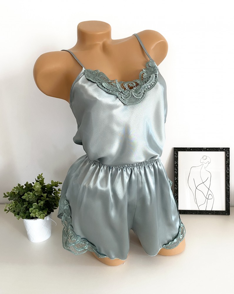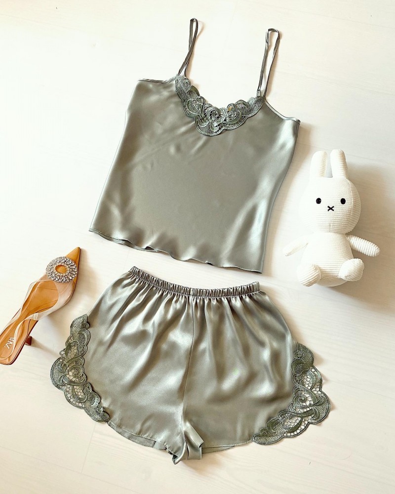 Pijama Dama ieftina cu aspect satinat formata din maieu cu bretele si pantaloni scurti cu dantela vernil - Versatila si Luminoasa