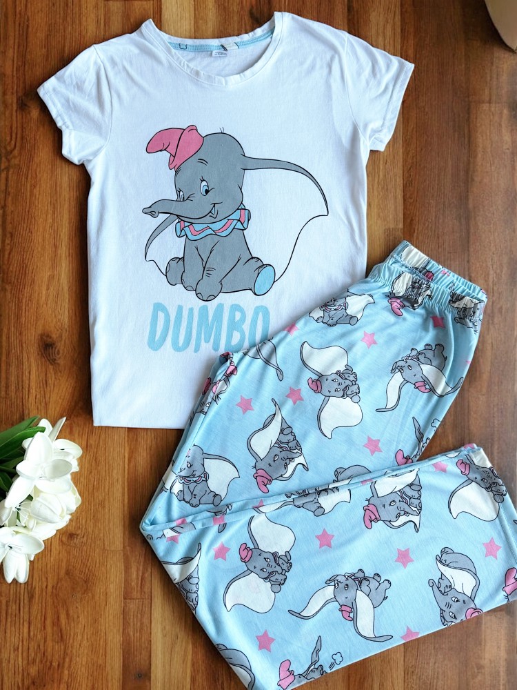 Pijama dama ieftina din bumbac cu tricou alb si pantaloni albastri cu imprimeu Dumbo