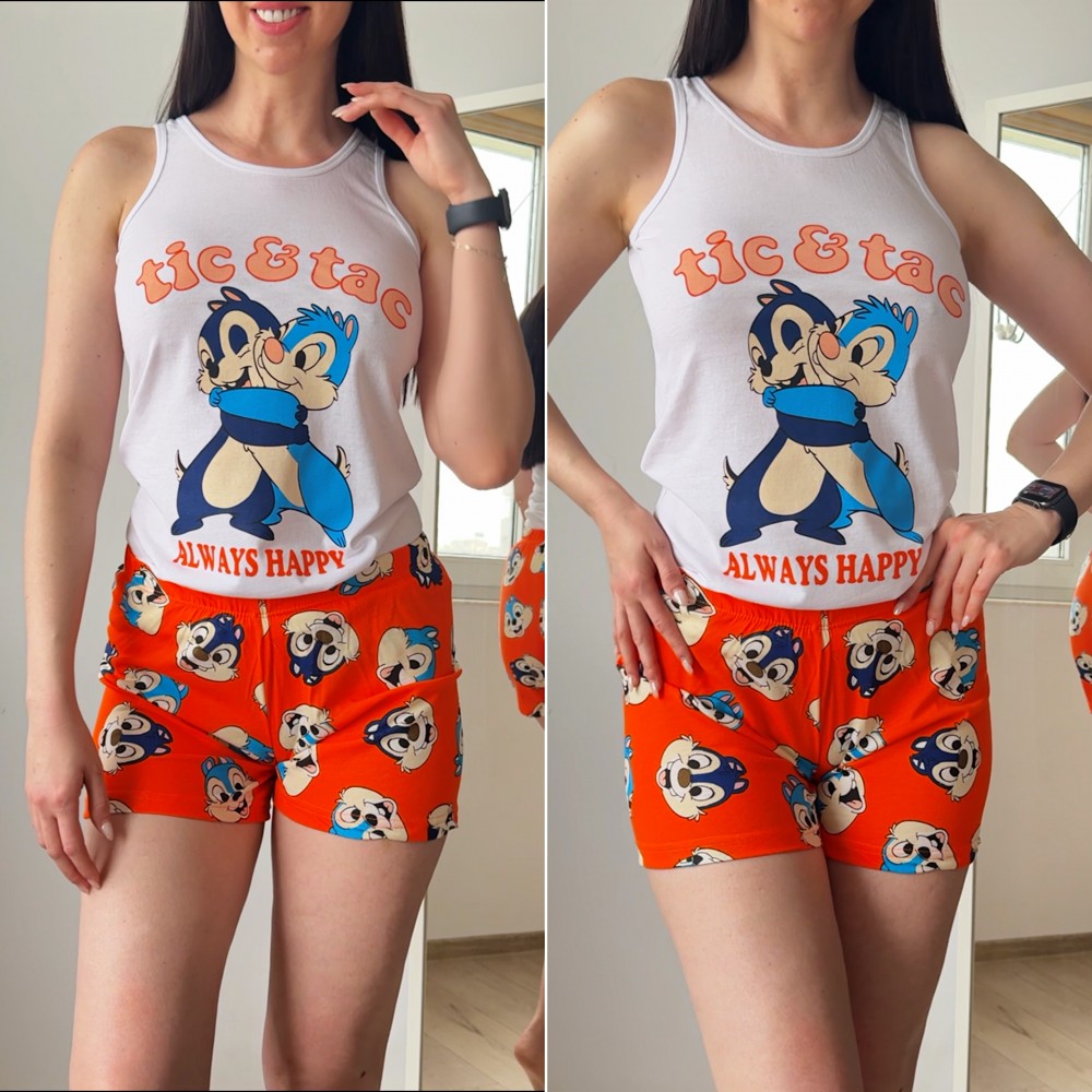 Pijama dama ieftina din bumbac formata din pantaloni scurti portocalii si maieu cu imprimeu ALWAYS HAPPY