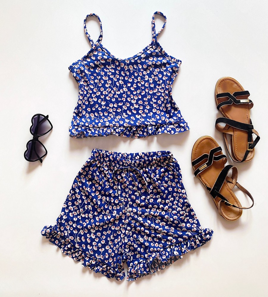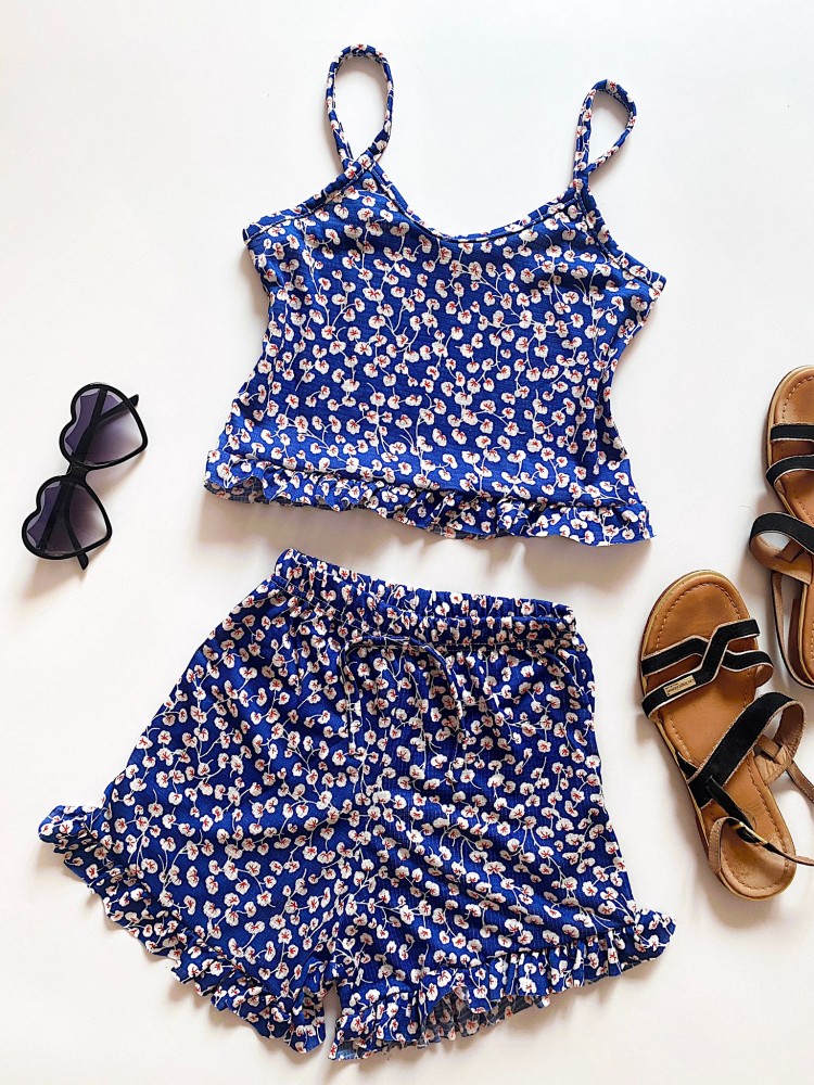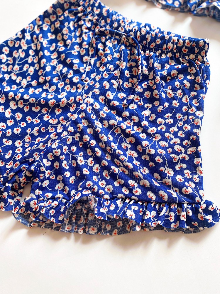 Pijama dama ieftina scurta albastra cu maieu cu volanase si imprimeu floricele albe cu rosu delicate