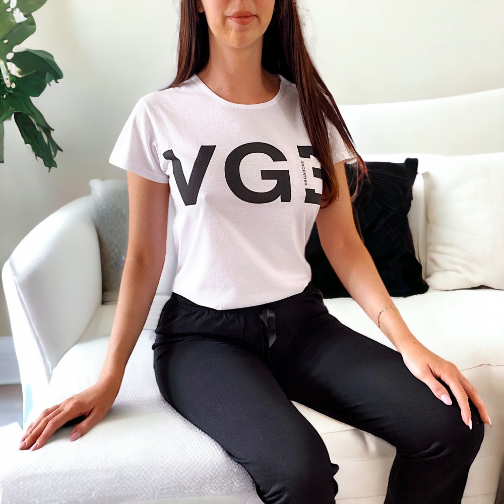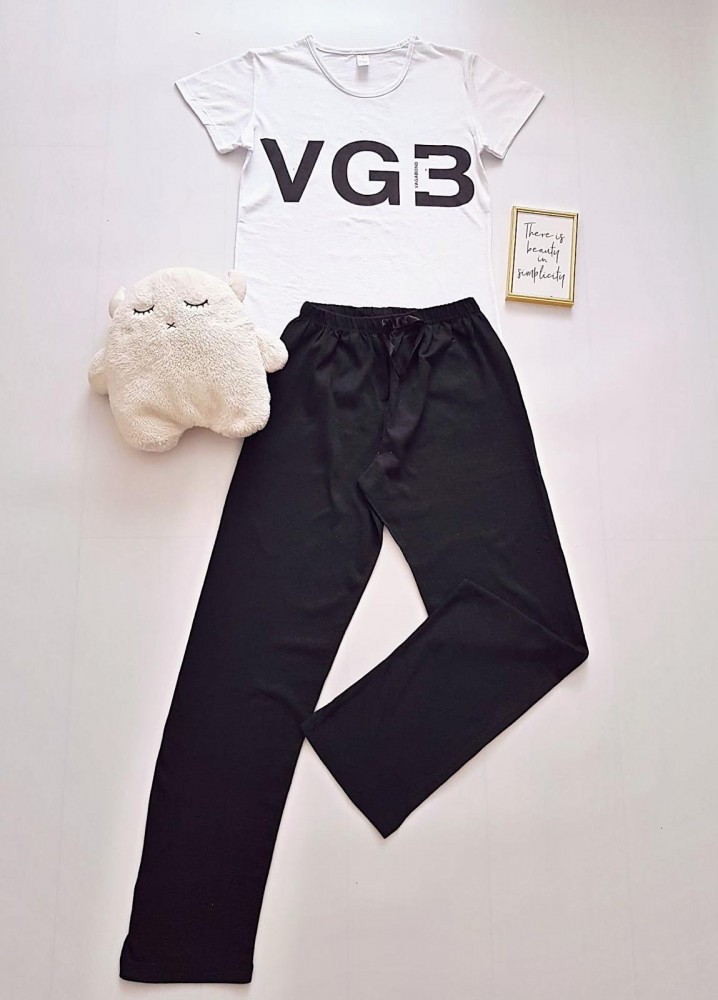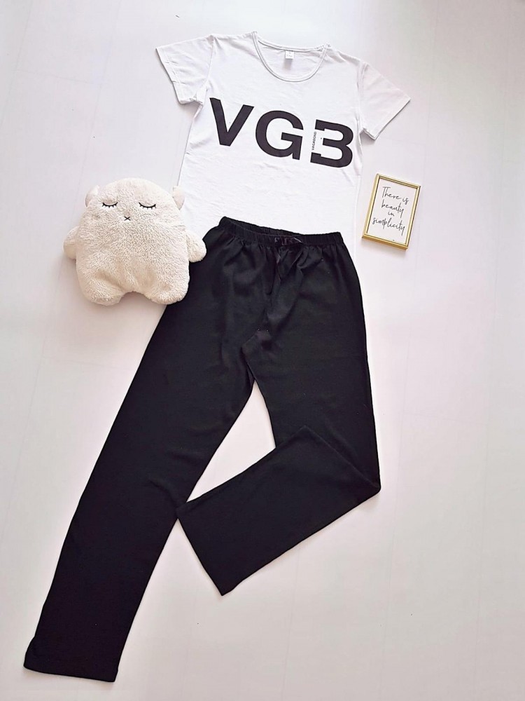 Pijama dama ieftina bumbac lunga cu pantaloni lungi negri si tricou alb cu imprimeu VGB
