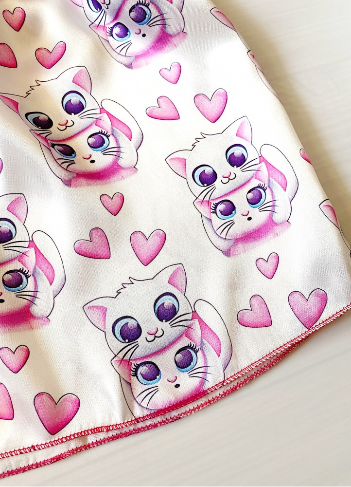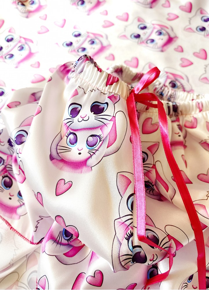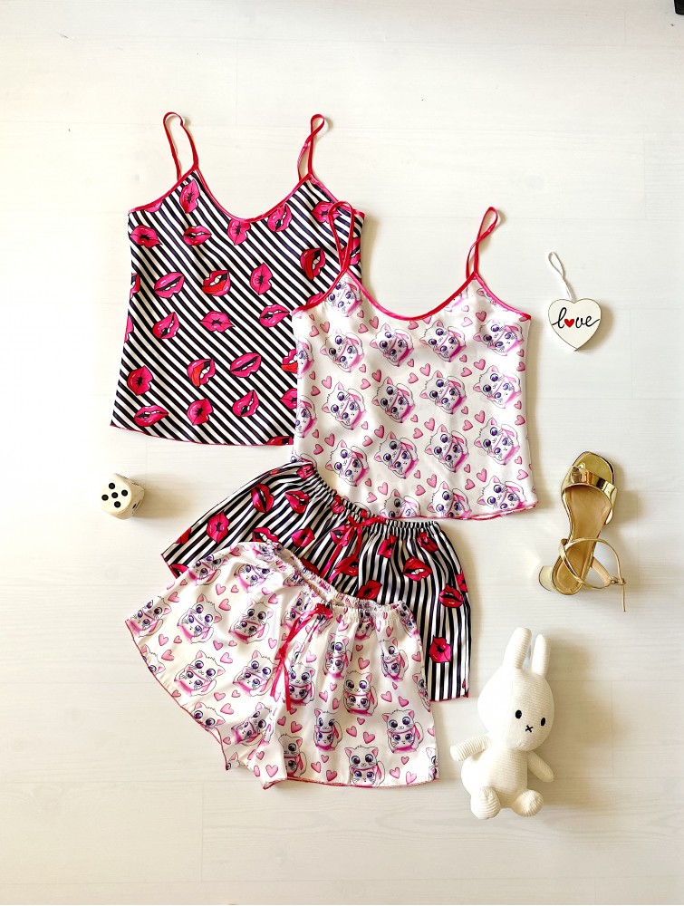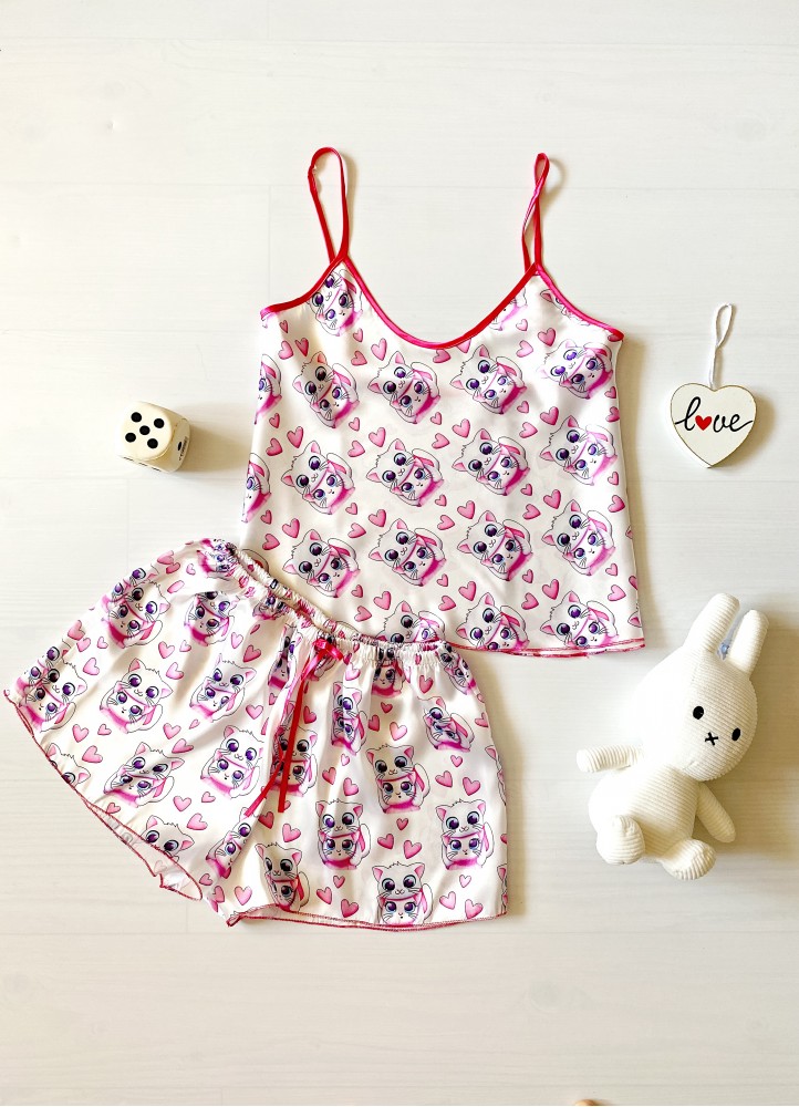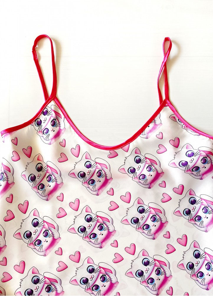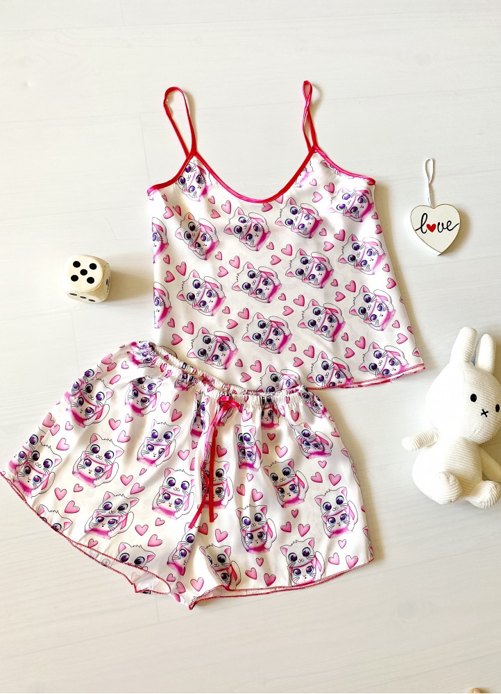 Pijama dama ieftina cu aspect satinat cu maieu si pantaloni scurti cu imprimeu Pisicute si Inimioare