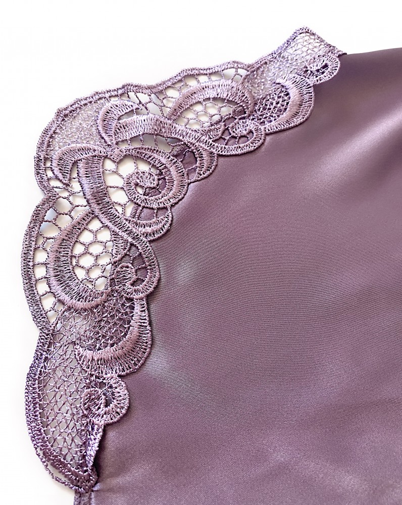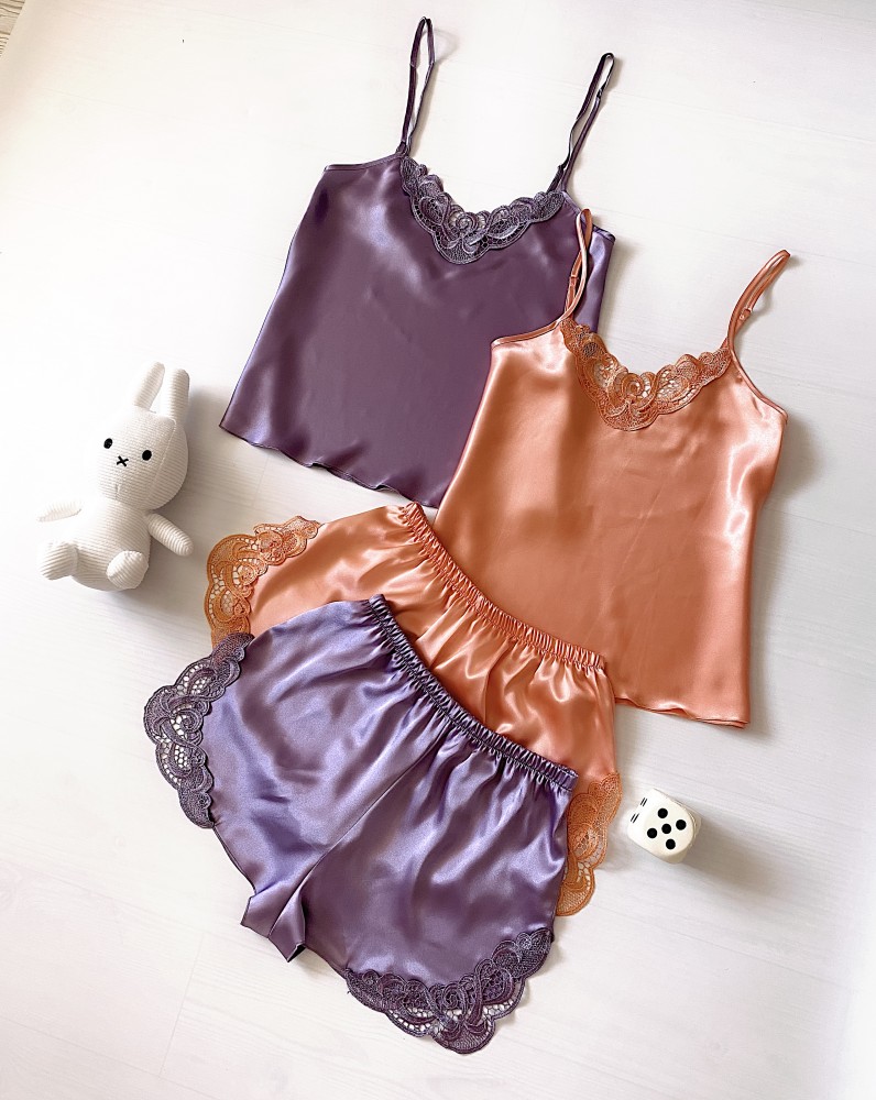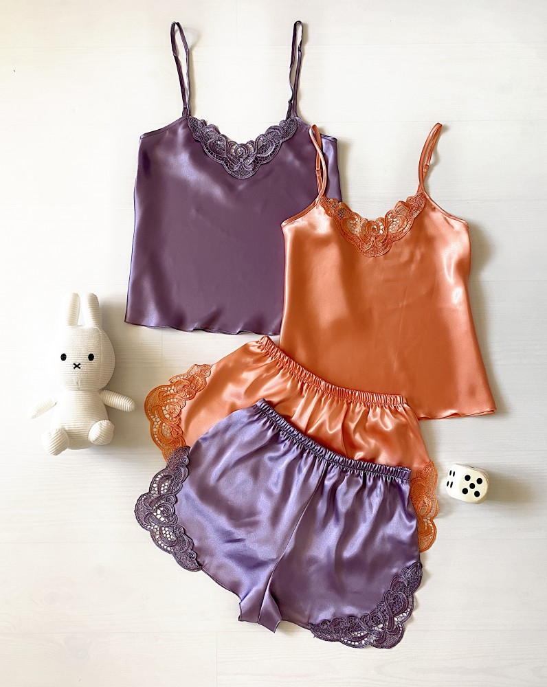 Pijama Dama ieftina cu aspect satinat formata din maieu cu bretele si pantaloni scurti cu dantela mov - Note Vibrante pentru Seri Pline de Culori