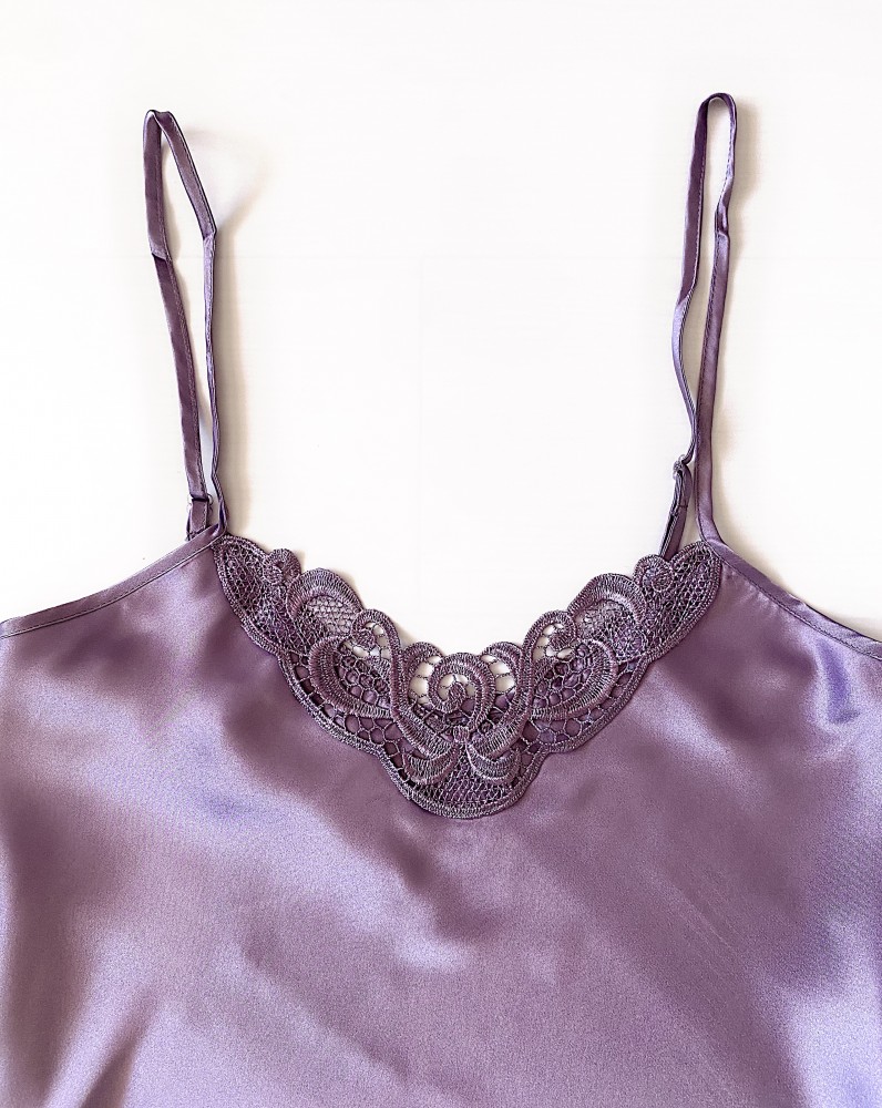 Bretelele subțiri ale maieului adaugă un strop de eleganță, iar dantela fină de pe șort îi conferă un farmec aparte.