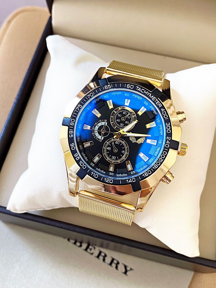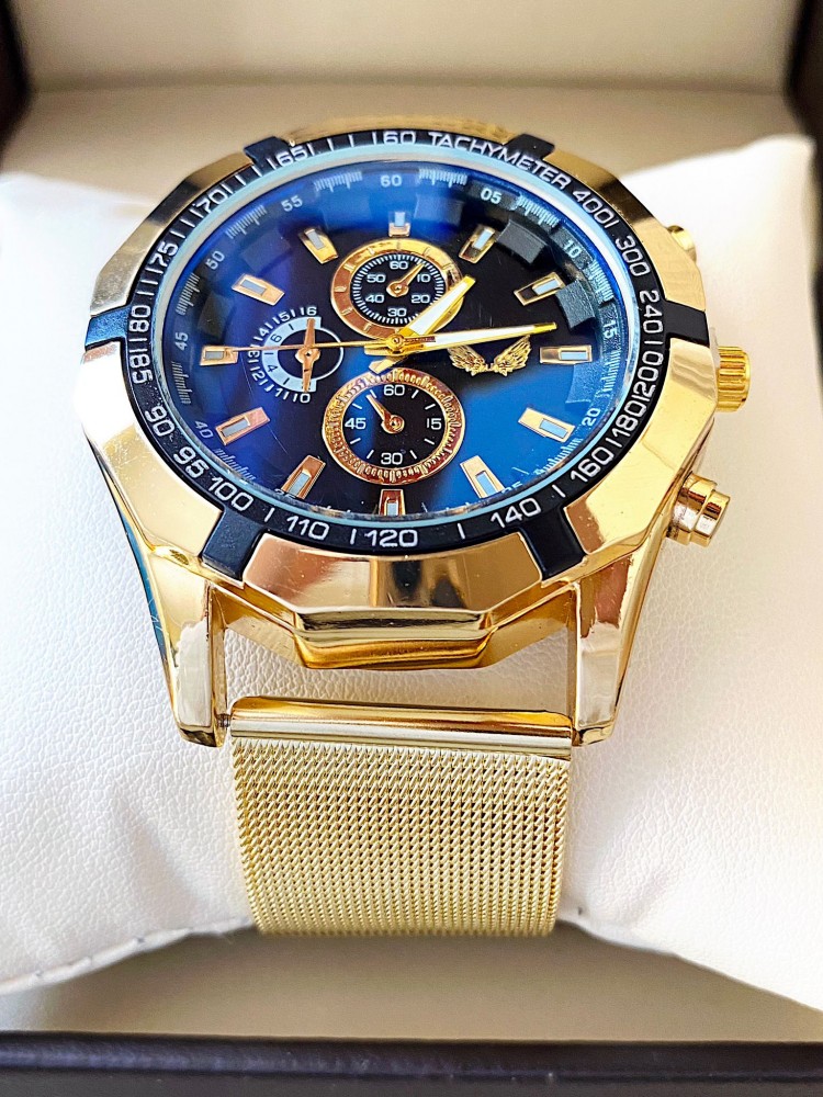 Ceas barbat auriu cu bratara metalica si cadran bleumarin