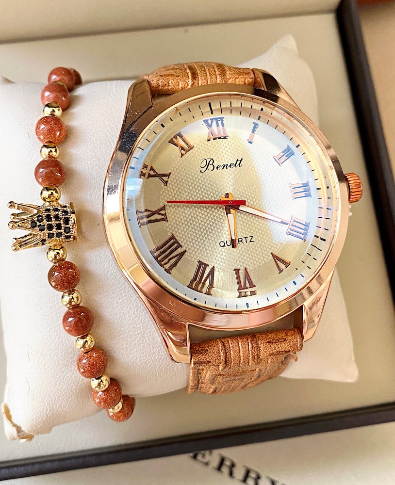 Ceas barbat cu bratara din piele ecologica maro si cadran cu cifre romane