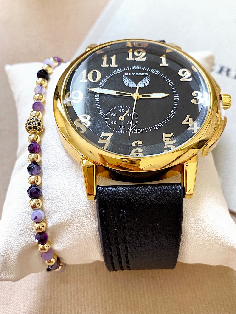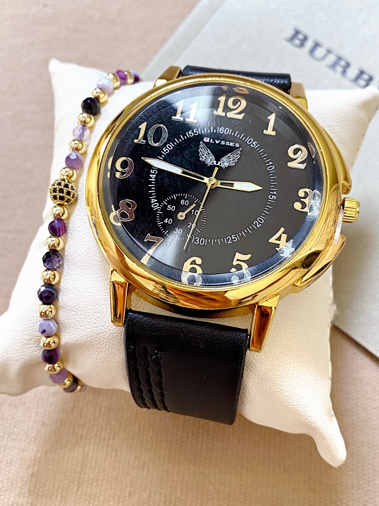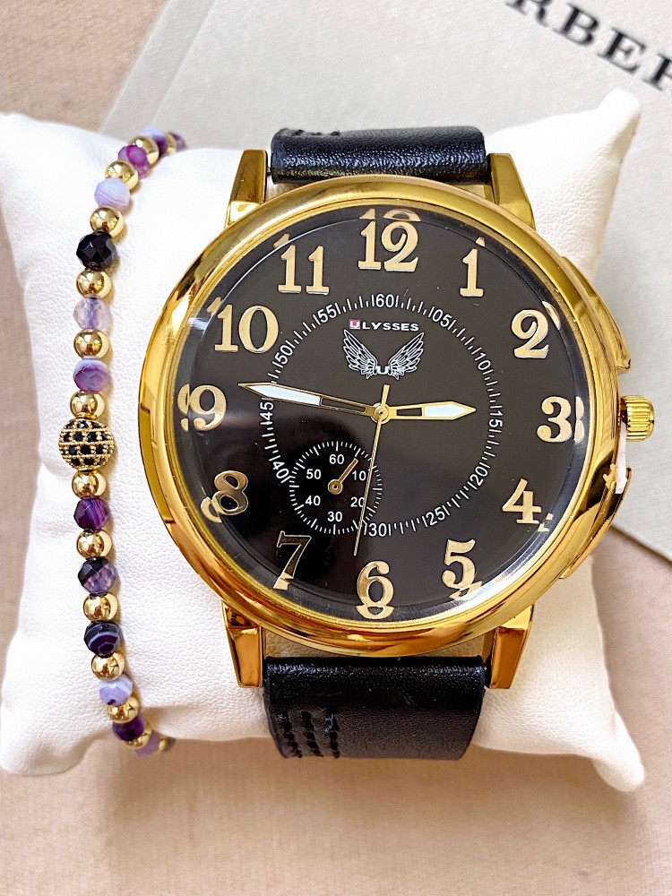 Ceas barbat negru cu bratara din piele ecologica si cadran cu cifre aurii
