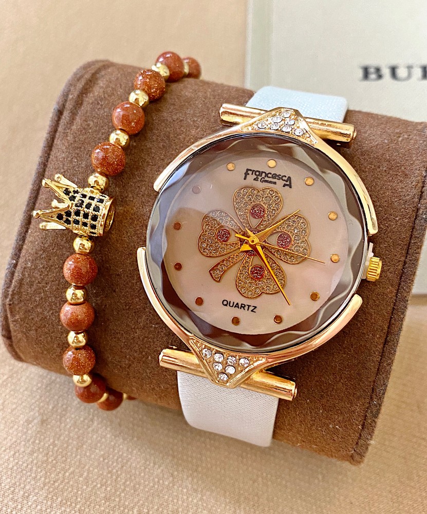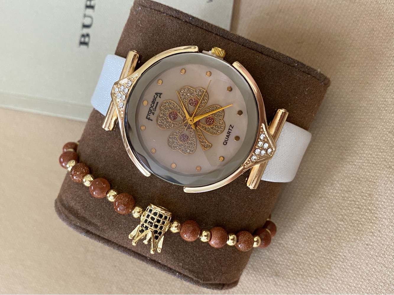 Ceas dama alb cu bratara din piele ecologica si cadran cu trifoi