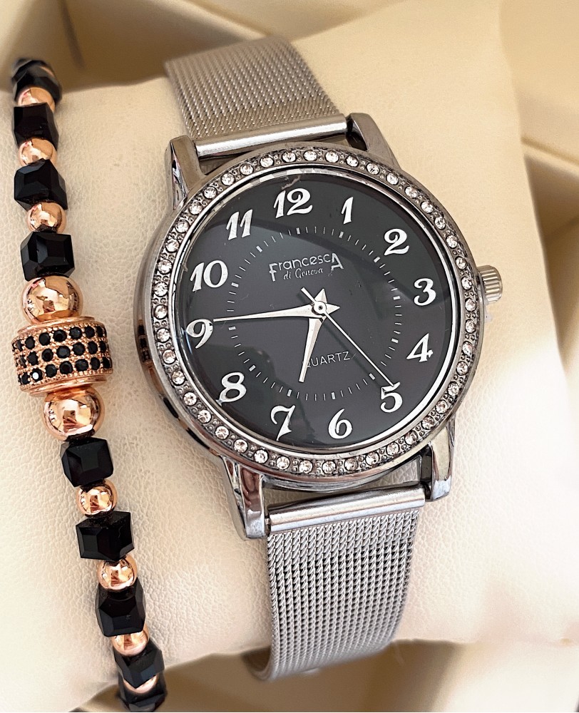 Ceas dama argintiu cu bratara metalica si cadran negru cu pietricele