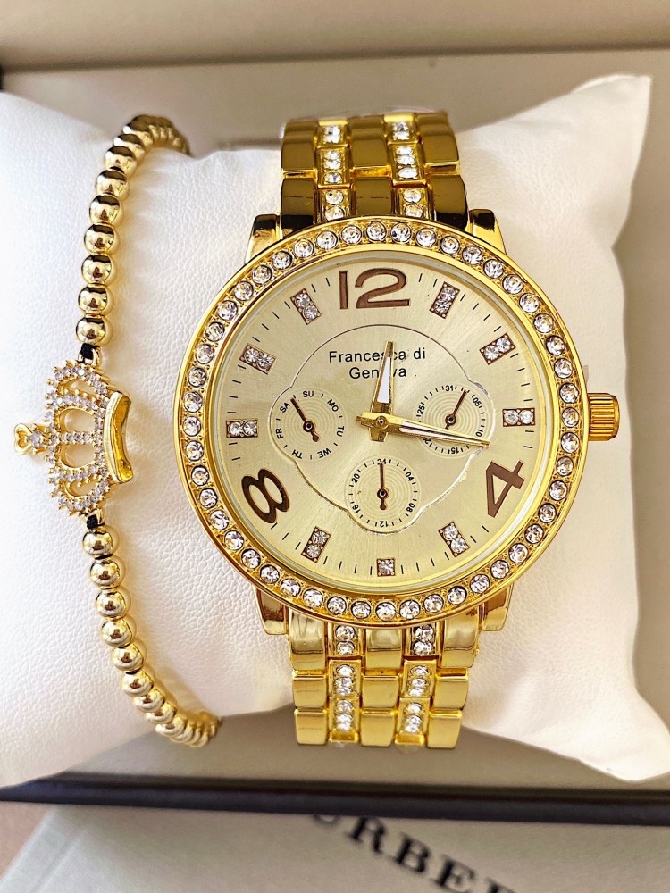 Ceas dama auriu cu bratara metalica si cadran cu 3 cifre si pietricele